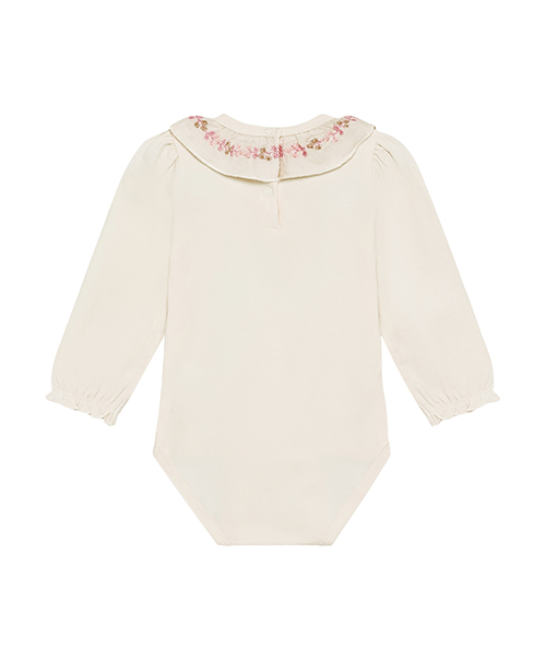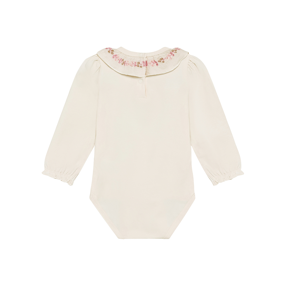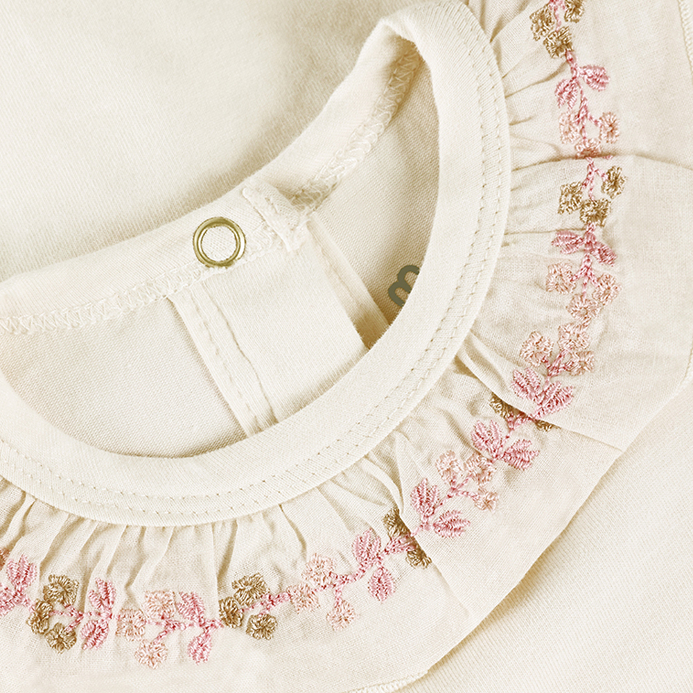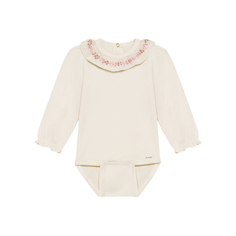 Minymo 長袖包屁衣,素色設計搭配領口荷葉邊細節,展現優雅甜美風格。袖口加入細緻打褶與彈性設計,穿著舒適又不失造型感。胯部採鈕釦開合,方便日常更換。