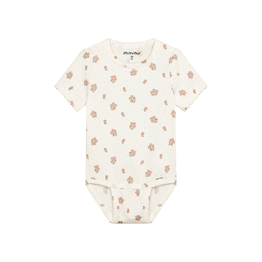 Minymo 短袖包屁衣,採滿版印花設計,袖口與領口點綴波浪邊細節,增添俏皮可愛感。胯部開釦設有兩段位置,可依寶寶成長調整,延長穿著時間,穿脫更輕鬆。