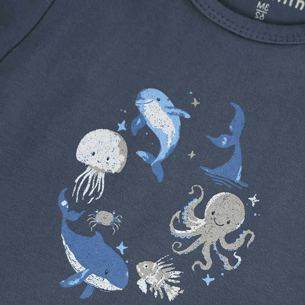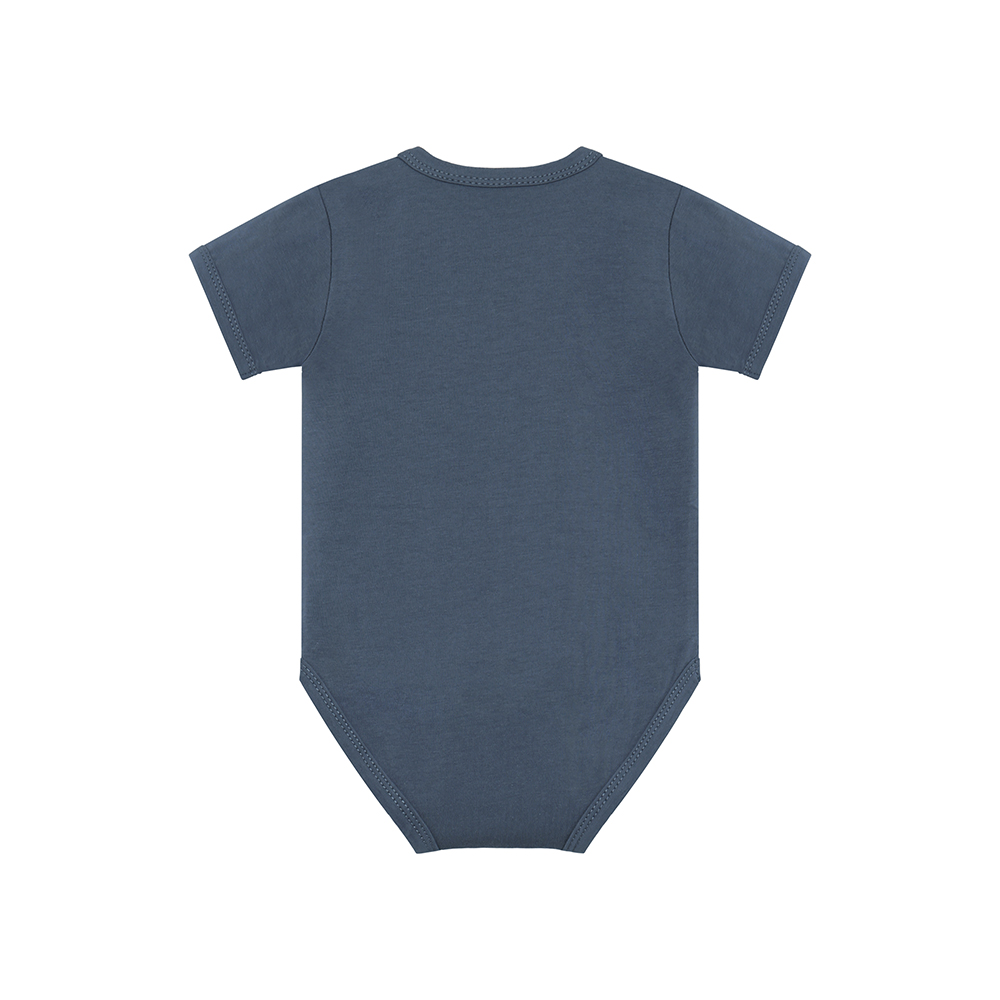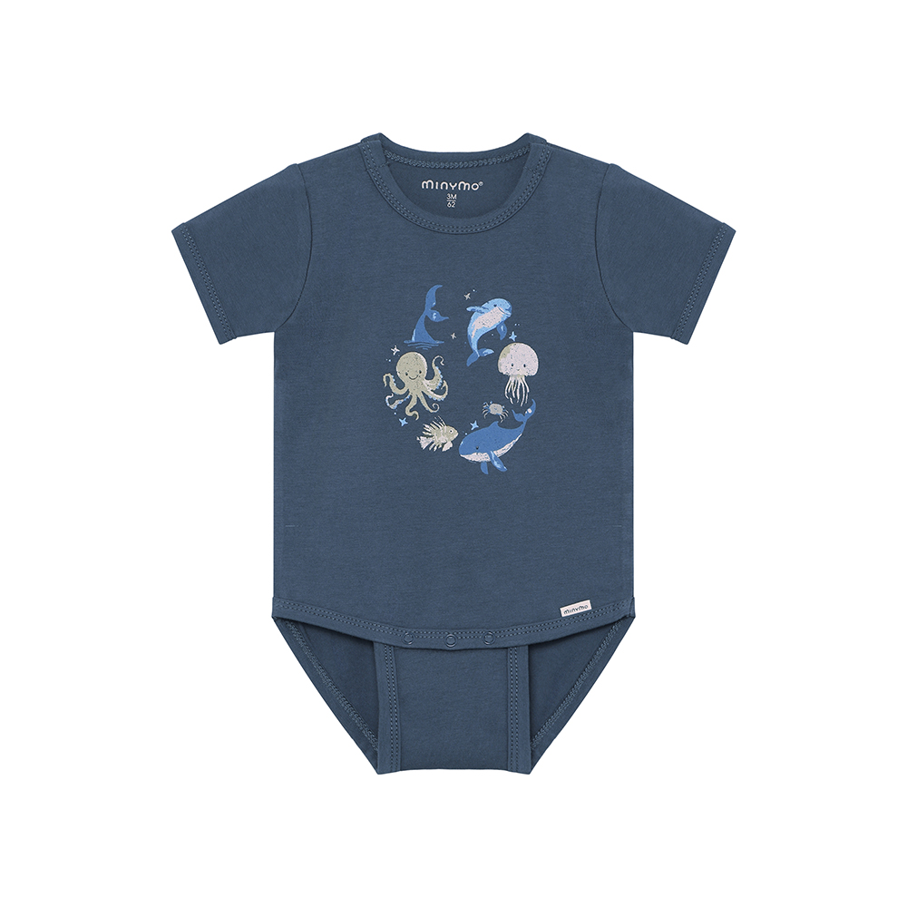 Minymo 短袖包屁衣,素色設計搭配胸前印花,簡約可愛。胯部開釦設有兩段位置,可依寶寶成長調整,延長穿著時間。