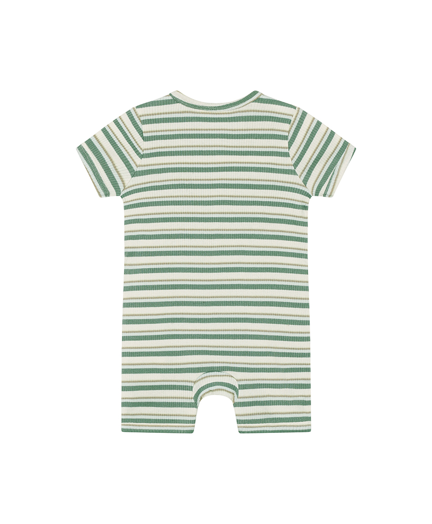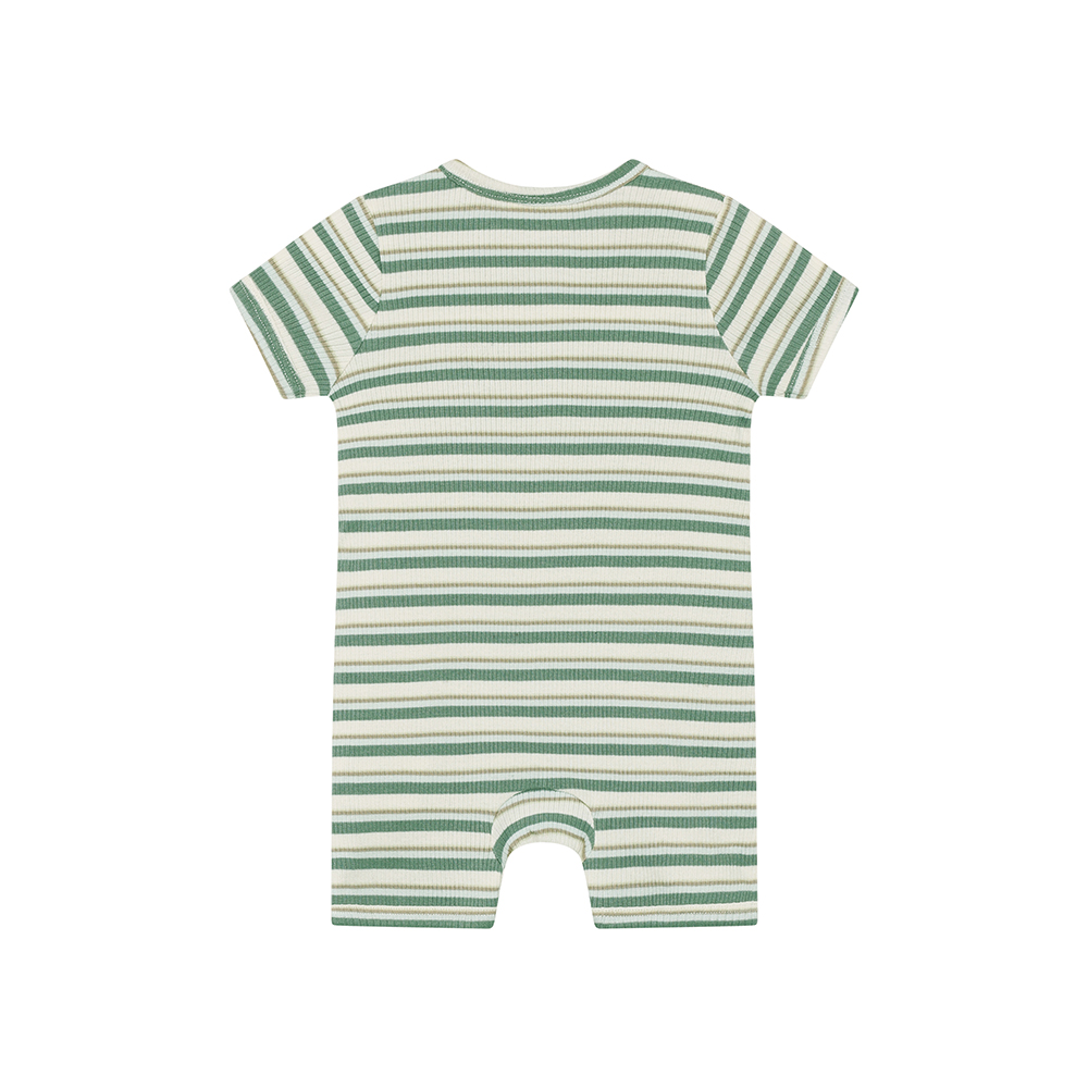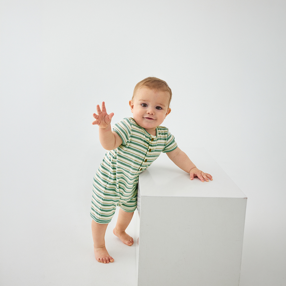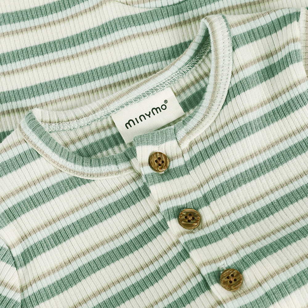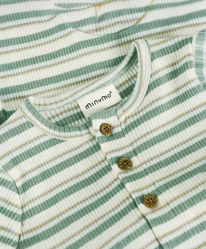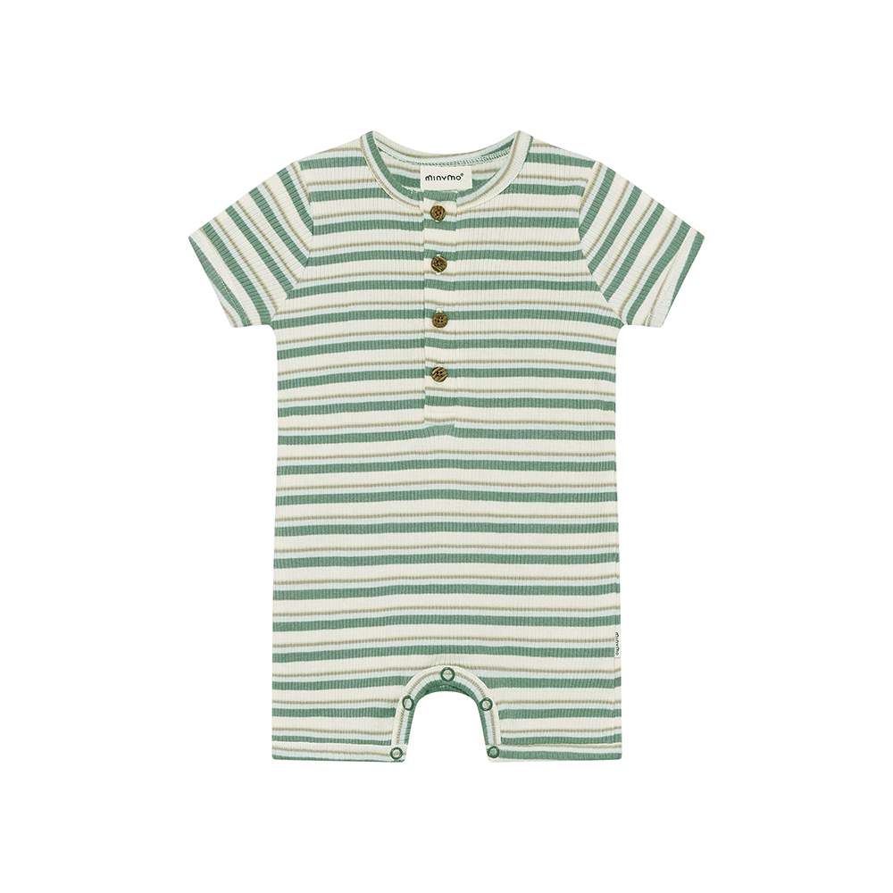 Minymo 短袖連身寬褲,採紗線染色條紋棉布製成,呈現自然質感條紋。胸前及胯部配有鈕釦開合,方便穿脫與更換尿布。