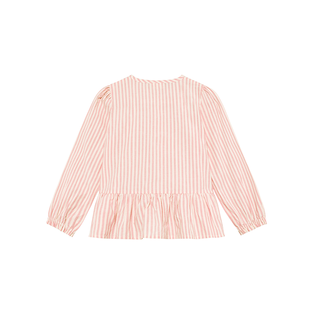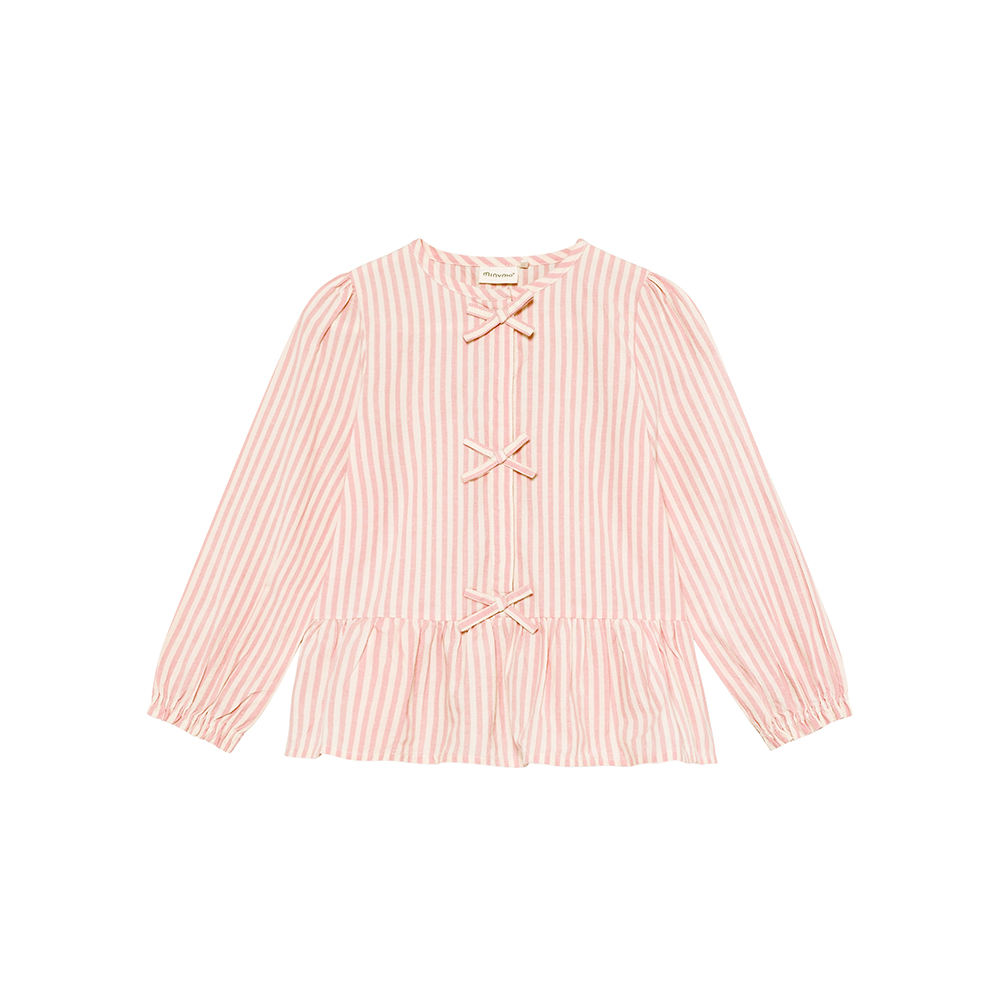 Minymo 條紋長袖襯衫,前襟點綴可愛蝴蝶結裝飾,圓領設計簡約大方,袖口鬆緊收口,下擺喇叭式寬鬆剪裁,穿著舒適自在。