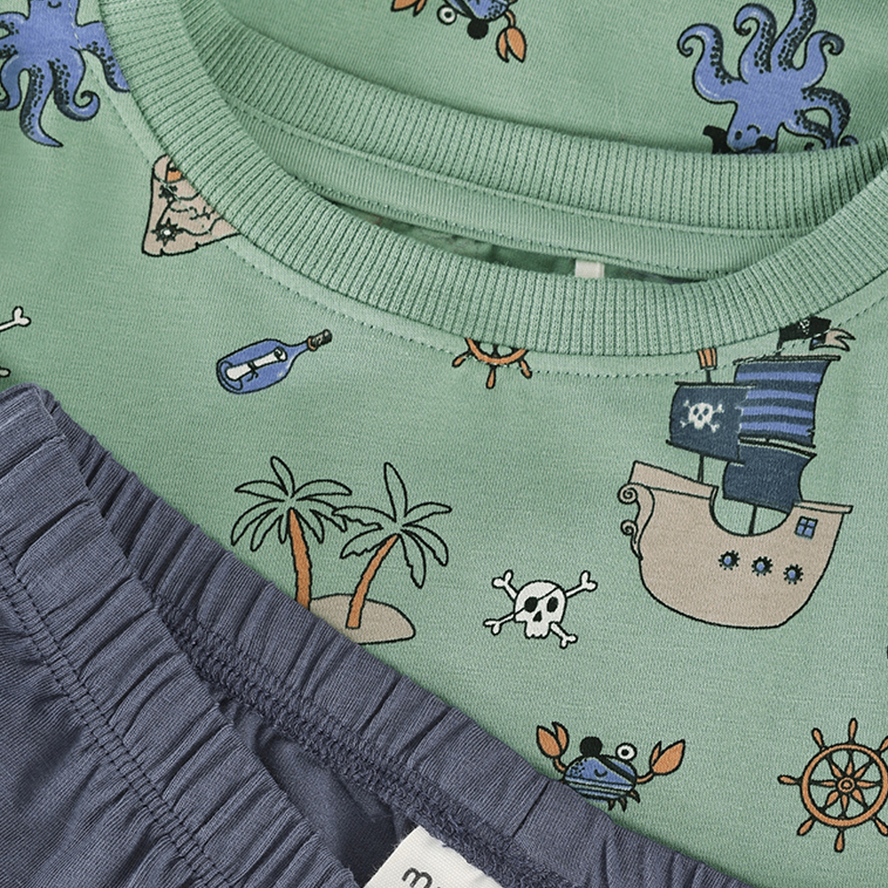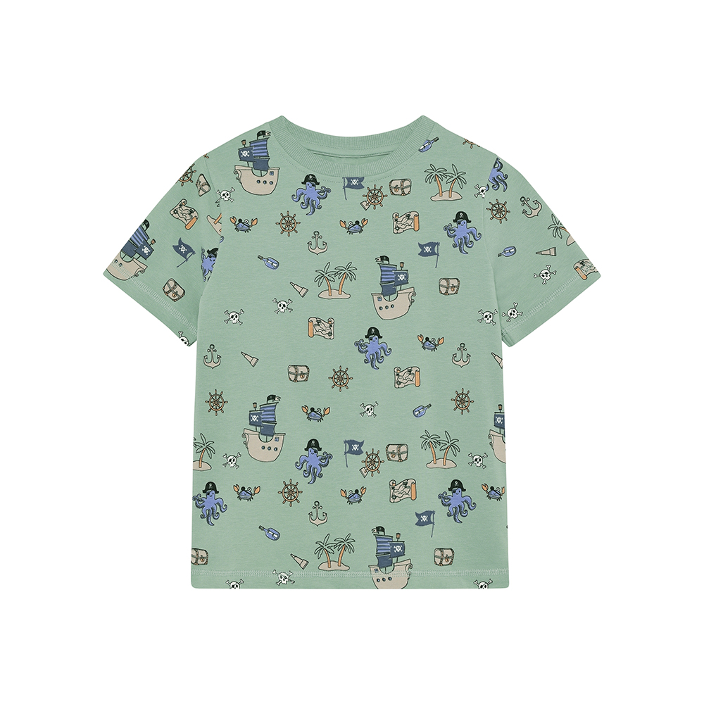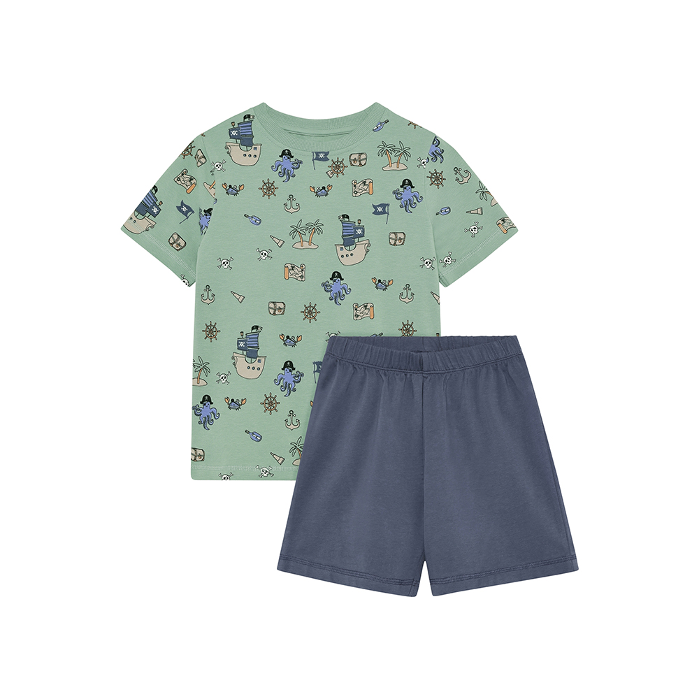 Minymo 短袖套裝,包含短袖上衣與短褲。上衣採全版印花設計,圓領剪裁簡約舒適;短褲素色設計,腰部彈性鬆緊帶,方便穿脫。