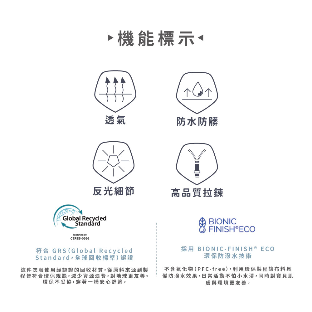 不含氟化物(PFC-free),利用環保製程讓布料具備防潑水效果,日常活動不怕小水漬,同時對寶貝肌膚與環境更友善。