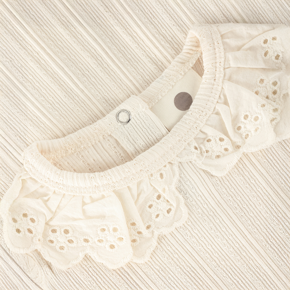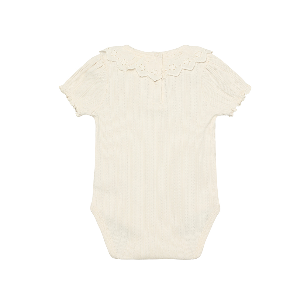 EN FANT 短袖包屁衣,領口織布翻領搭配刺繡細節,增添優雅精緻感。身體採網眼布料,柔軟透氣,並配有背部及胯部鈕釦開合,方便穿脫與換尿布。