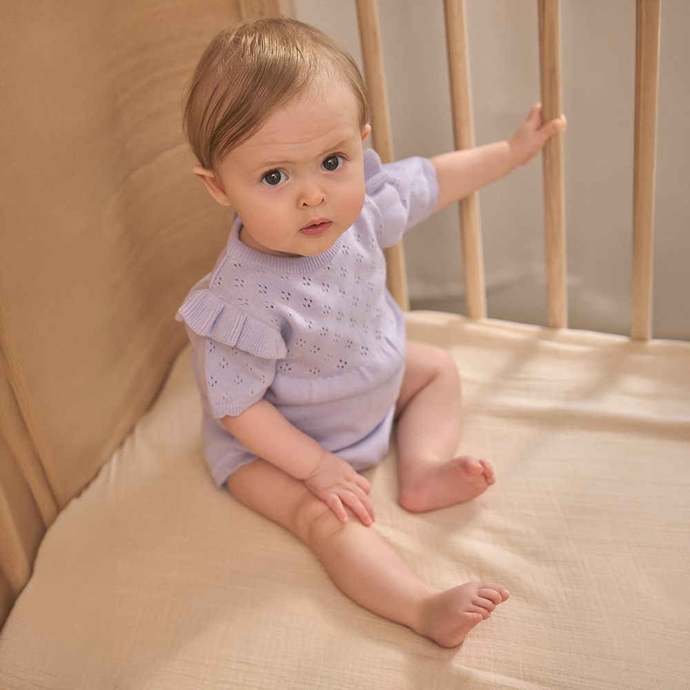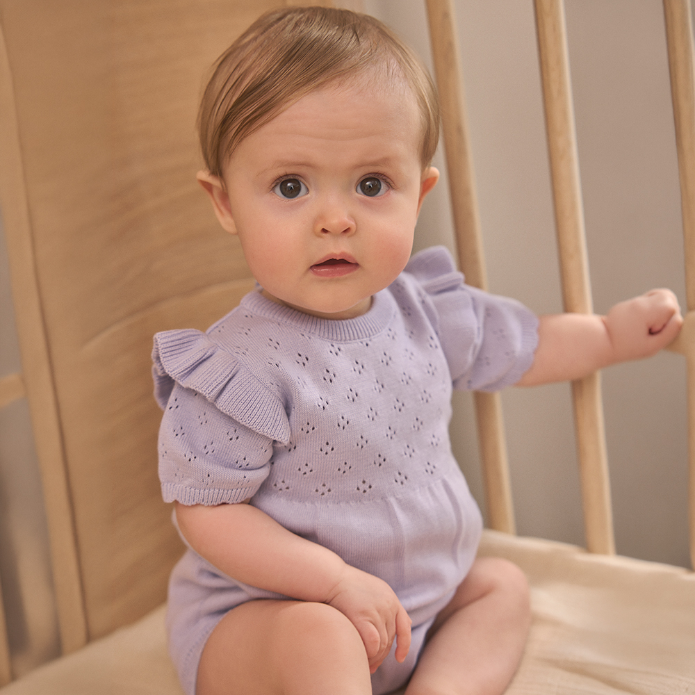 EN FANT 針織短袖包屁衣,肩部荷葉邊設計,袖口與褲腳貝殼邊點綴,增添甜美細節。胸下剪裁抓皺設計,打造柔美層次感。背部及胯部鈕釦開合,方便穿脫與更換尿布。