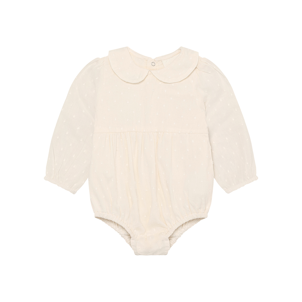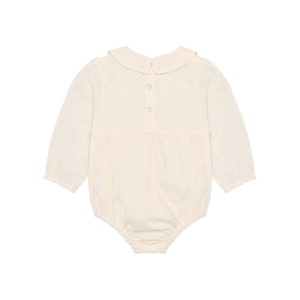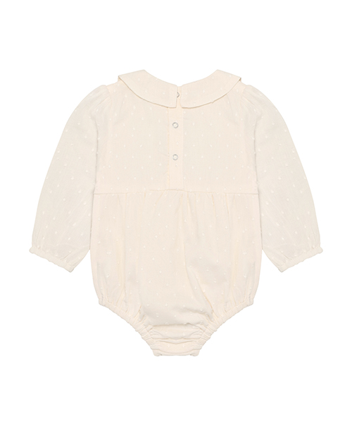 EN FANT 長袖包屁衣,採素色帶有立體點點的布料,肩部抓皺設計,袖口與褲口彈性收口,胸下剪裁抓皺,增加立體感與舒適度。