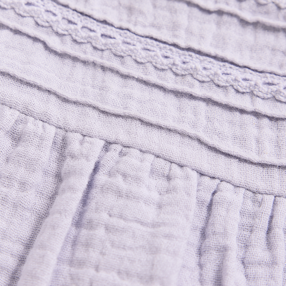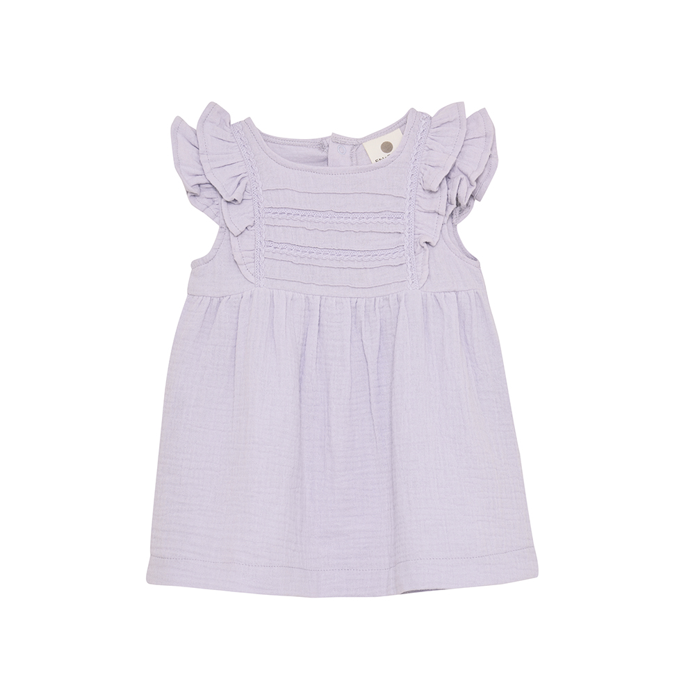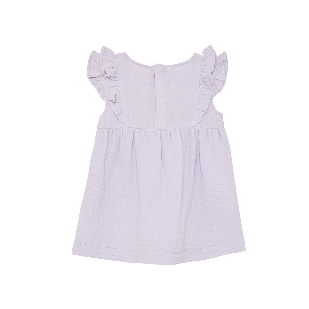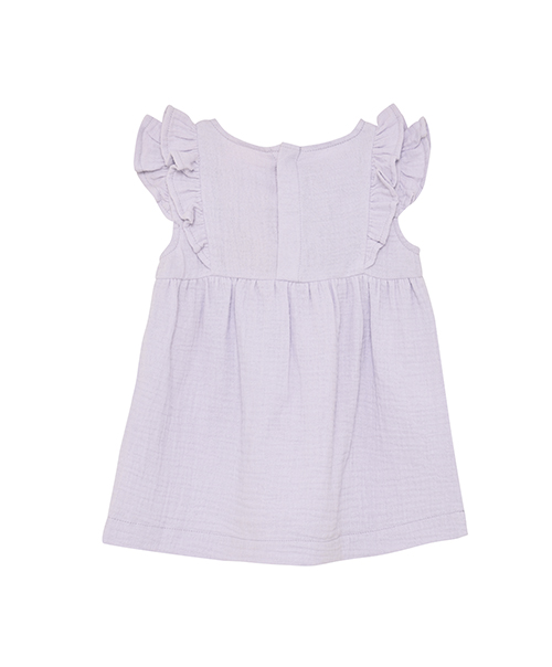 EN FANT 無袖洋裝,採紗布材質,肩部荷葉邊設計,腰部裙擺抓皺,展現甜美俏麗感。胸前蕾絲條細節點綴,背部鈕釦開合設計,方便穿脫。
