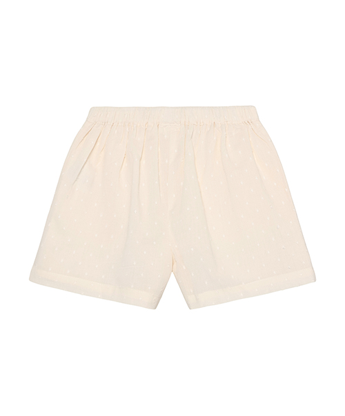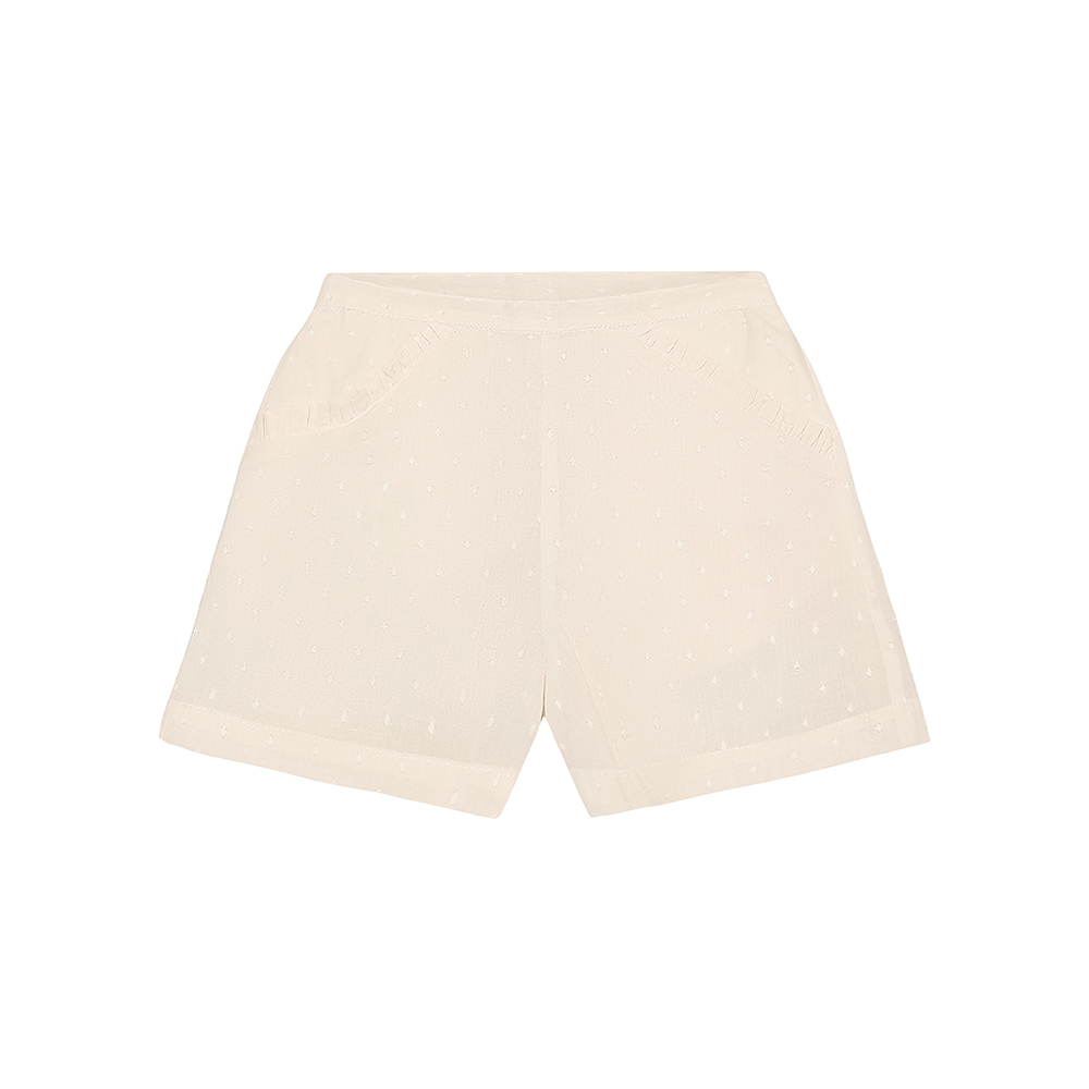 EN FANT 短褲採素色帶有立體點點的布料,寬褲管設計,穿著舒適自在。口袋處點綴荷葉邊細節,增添甜美感;腰部彈性鬆緊帶,貼合好穿。