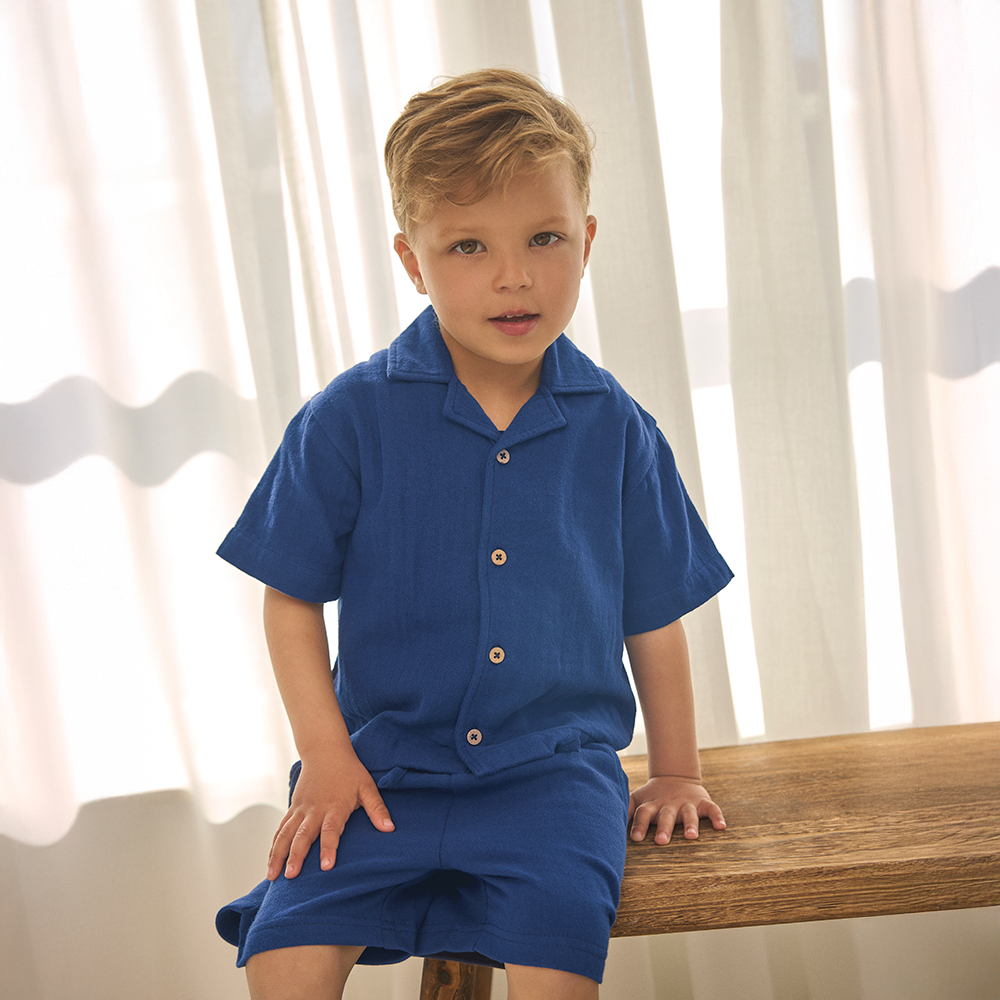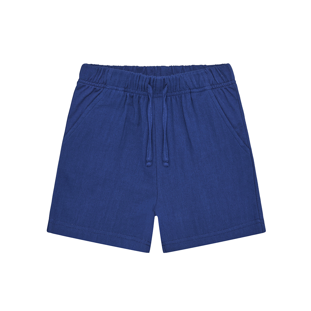 EN FANT 拼接短褲,採用雙材質設計:前片為輕柔 Muslin 紗布,後片為舒適棉質布料,兼具質感與舒適度。設有假抽繩設計、前方口袋,腰部彈性鬆緊帶,穿著方便自在。