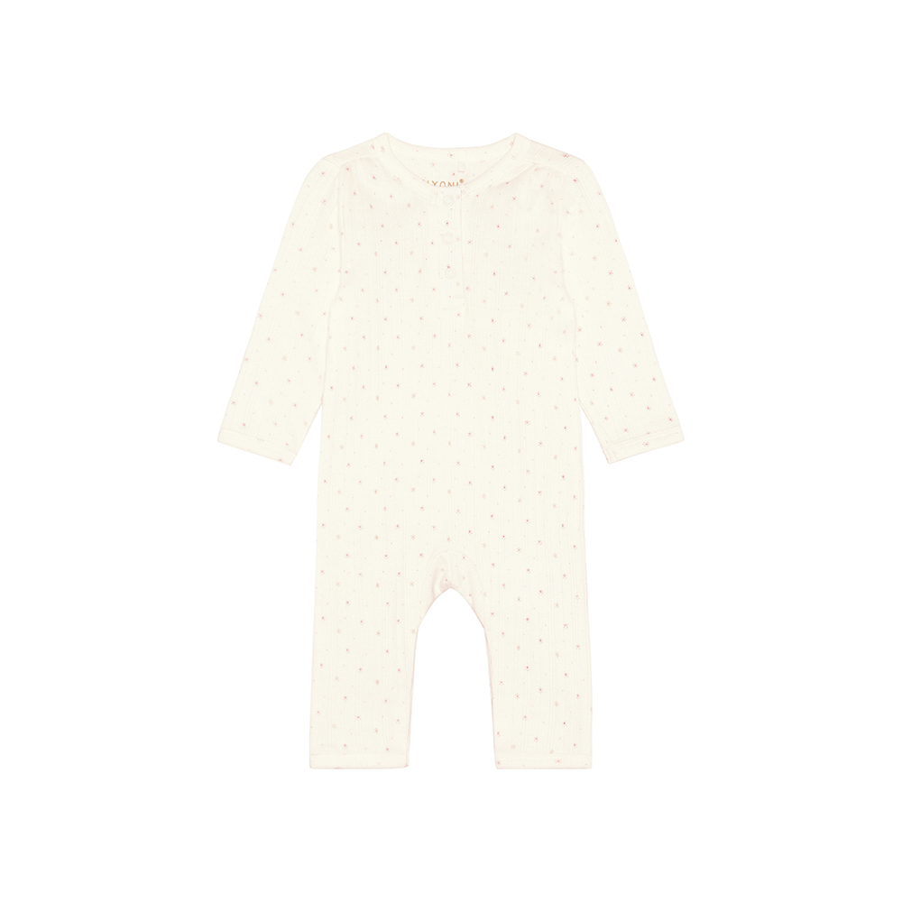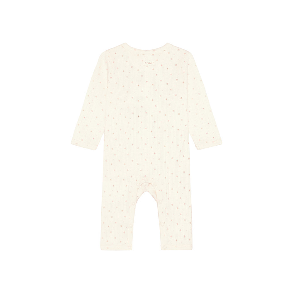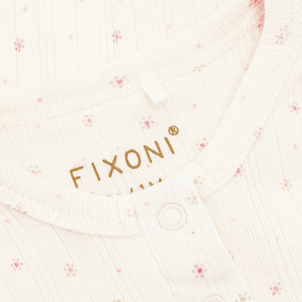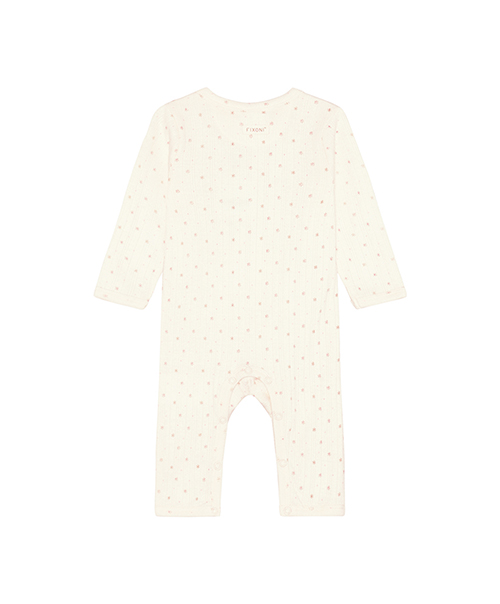 FIXONI 長袖連身兔裝,採滿版印花設計,落肩剪裁呈現自然寬鬆 Oversize 風格。胸前及胯部鈕釦開合設計,方便穿脫與換尿布。