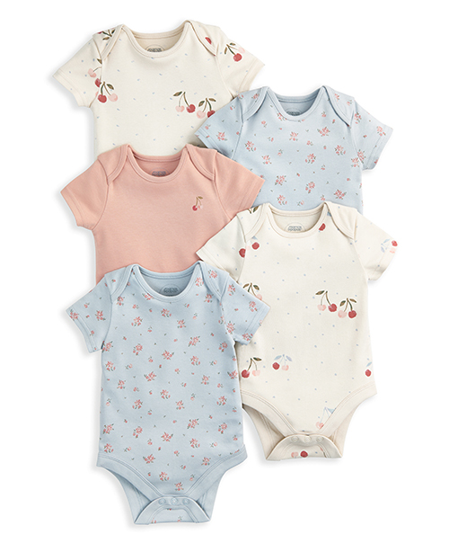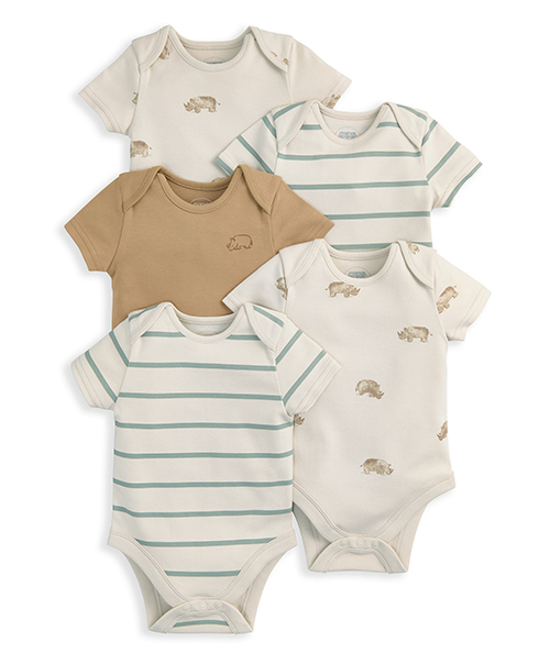 FIXONI 短袖包屁衣兩件組,一件為滿版印花設計,另一件為素色搭配胸前印圖,日常替換更方便。胯部處設有實用鈕釦,穿脫與更換尿布輕鬆省時,適合寶寶日常活動穿著。