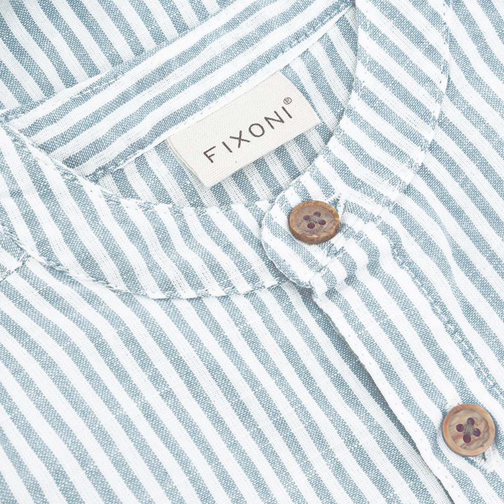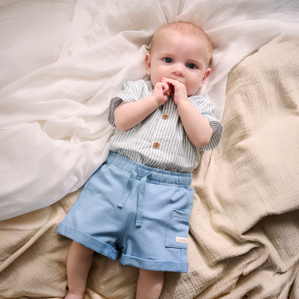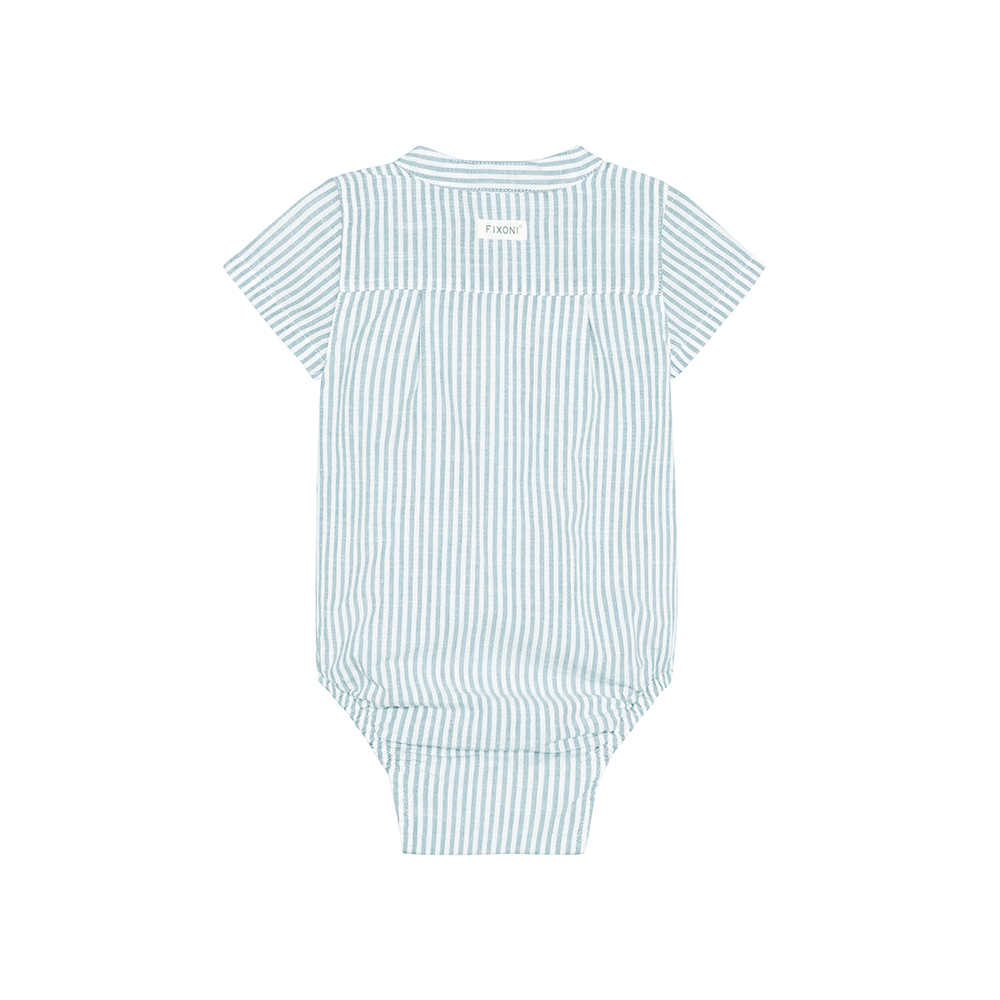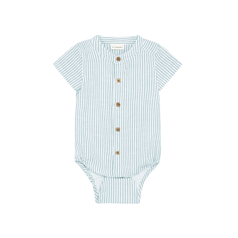 FIXONI 條紋包屁衣,採滿版條紋設計,正面鈕釦開合,胯部設有實用開釦,方便更換尿布。腿部彈性鬆緊設計,穿著舒適靈活。