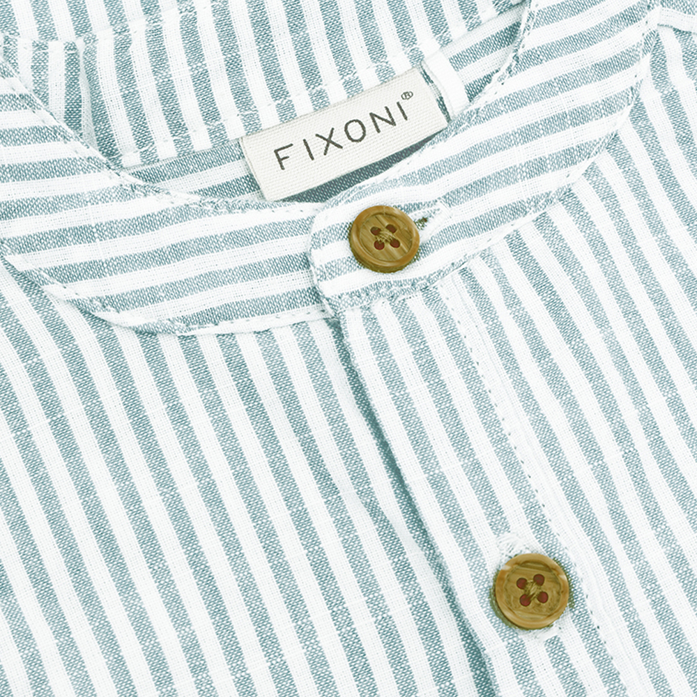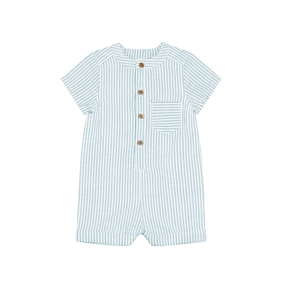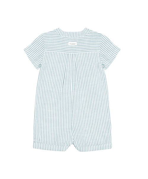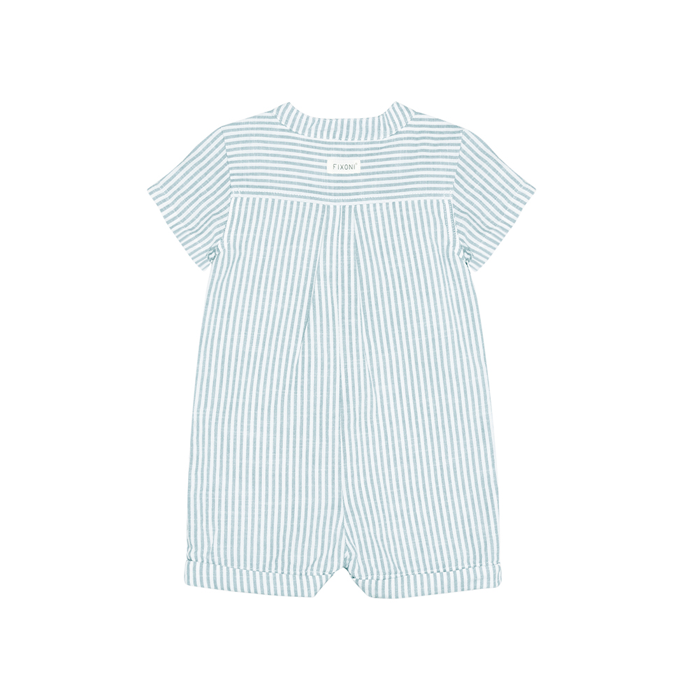 FIXONI 短袖連身寬褲,採條紋設計,胸前口袋細節,增添俏皮感。前襟及胯部鈕釦開合設計,方便穿脫與更換尿布。
