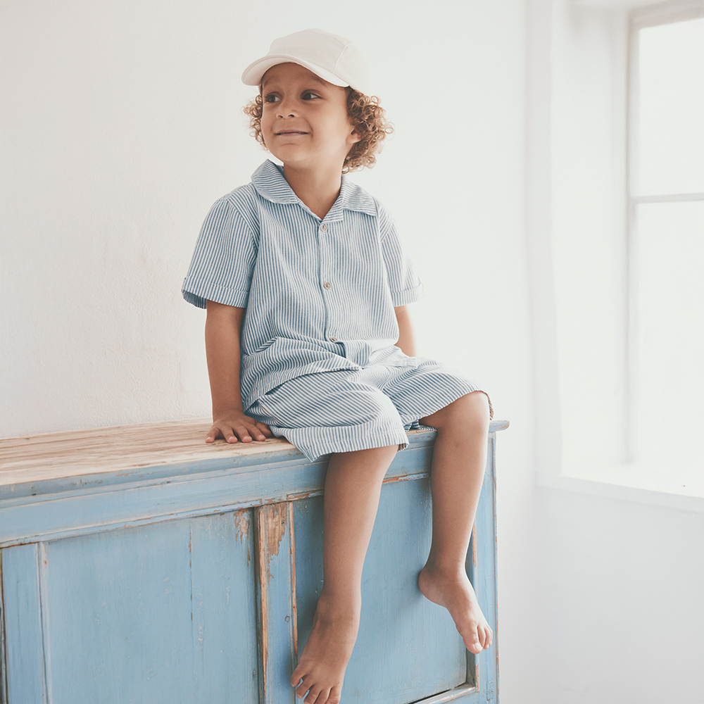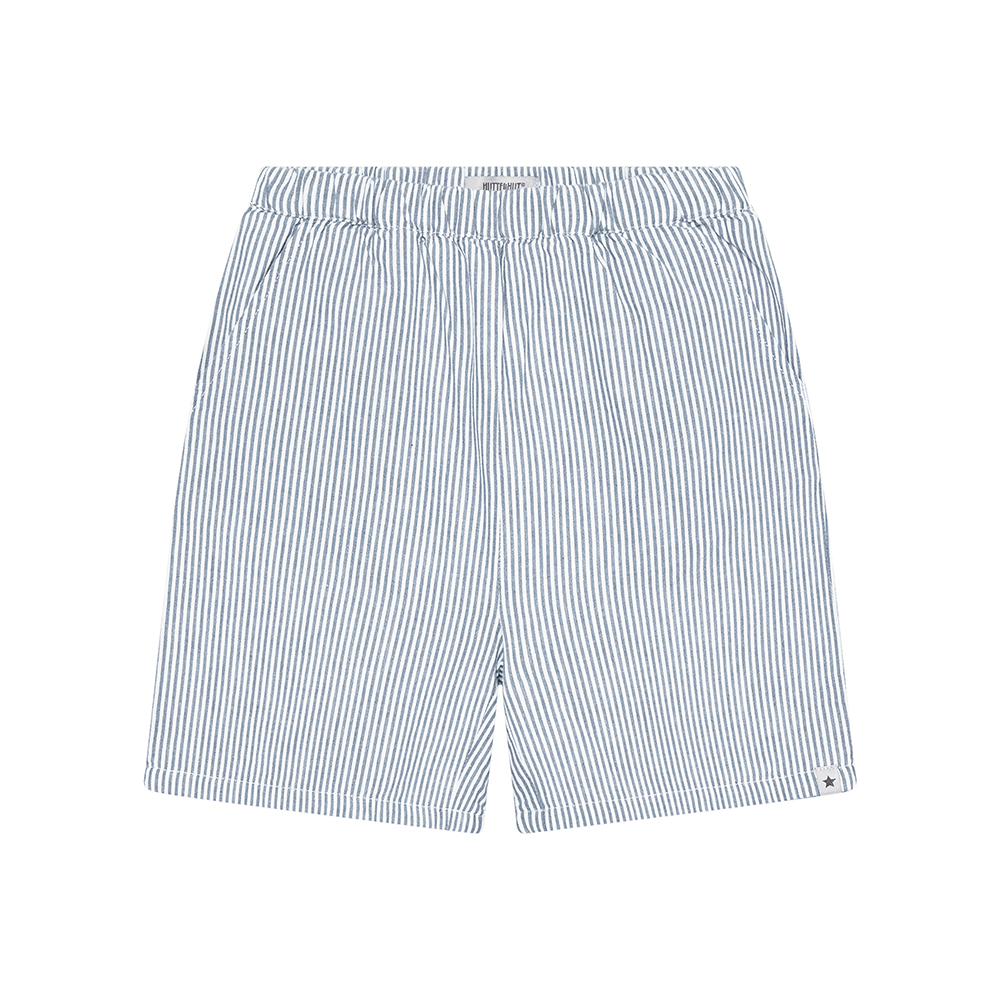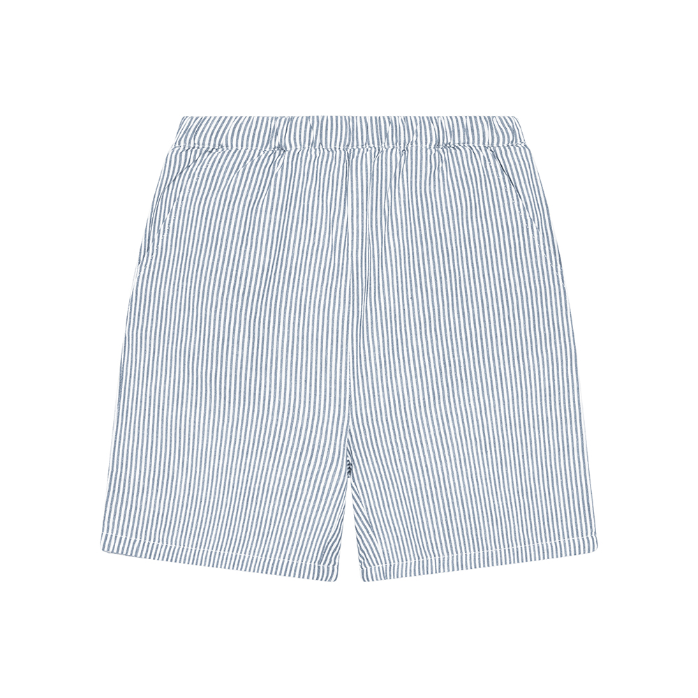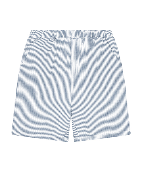 HUTTEliHUT 條紋短褲,採棉質布料搭配輕薄襯裡,柔軟親膚,穿著舒適。腰部彈性鬆緊帶與可調節設計,方便貼合寶寶身形,兩側設有實用口袋。