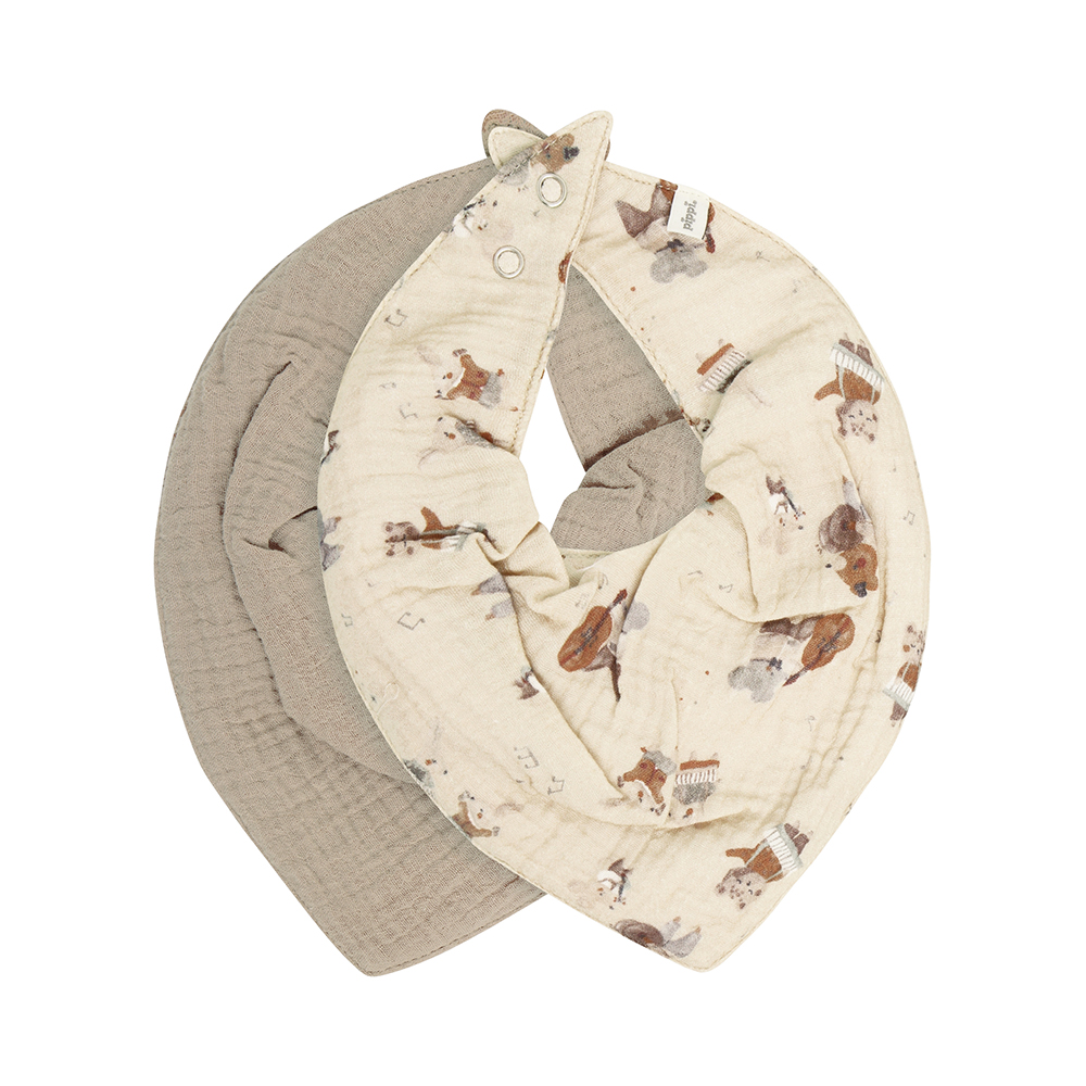 2 入組的紗布圍兜採用柔軟紗布質地,內層貼心添加防滲水層,有效隔離口水與溢奶。