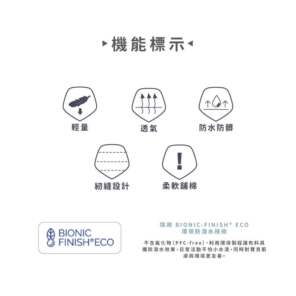 不含氟化物(PFC-free),利用環保製程讓布料具備防潑水效果,日常活動不怕小水漬,同時對寶貝肌膚與環境更友善。