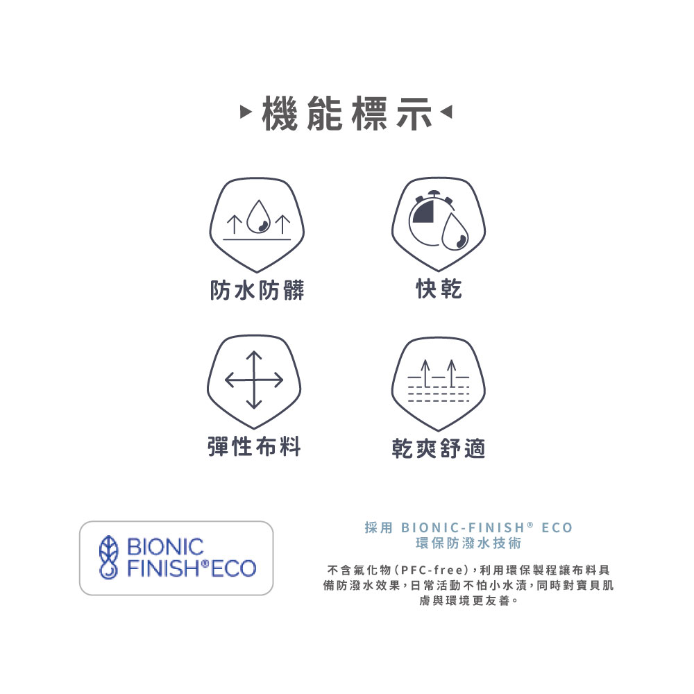 不含氟化物(PFC-free),利用環保製程讓布料具備防潑水效果,日常活動不怕小水漬,同時對寶貝肌膚與環境更友善。