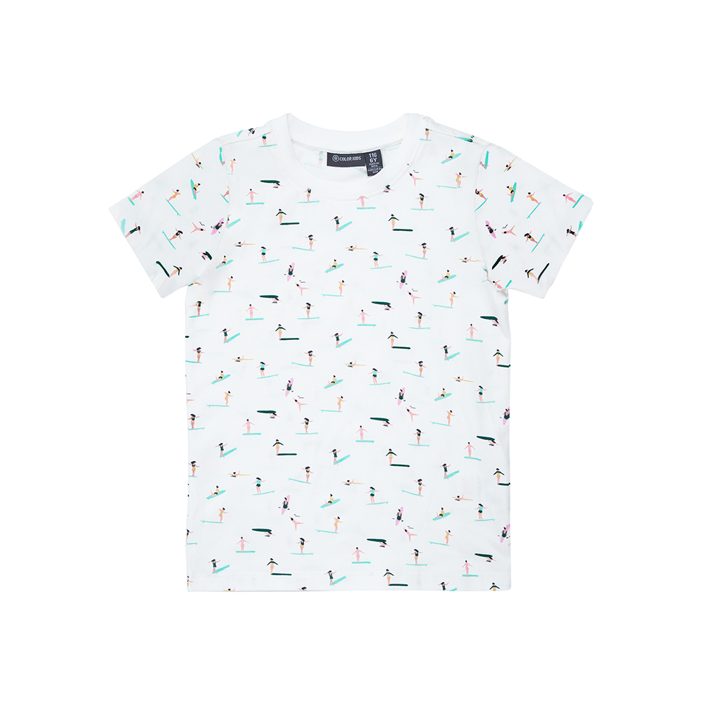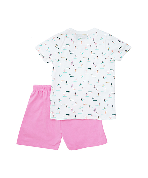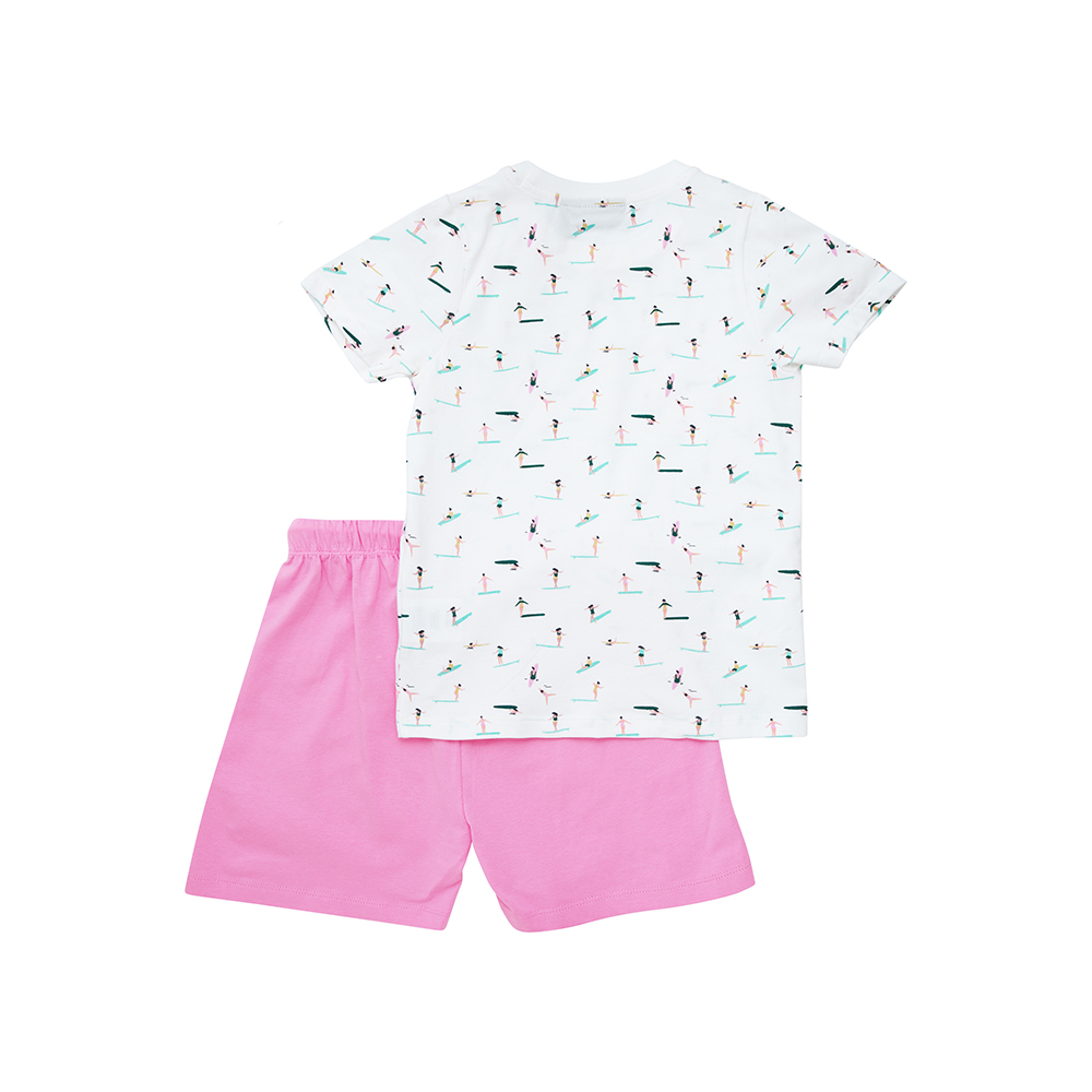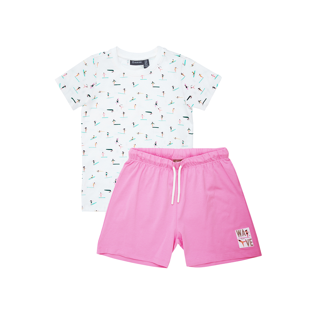 Color Kids 短袖套裝,包含短袖印花上衣與短褲,增添俏皮可愛感。短褲腰部彈性鬆緊帶並附可調節抽繩,穿著舒適靈活。
