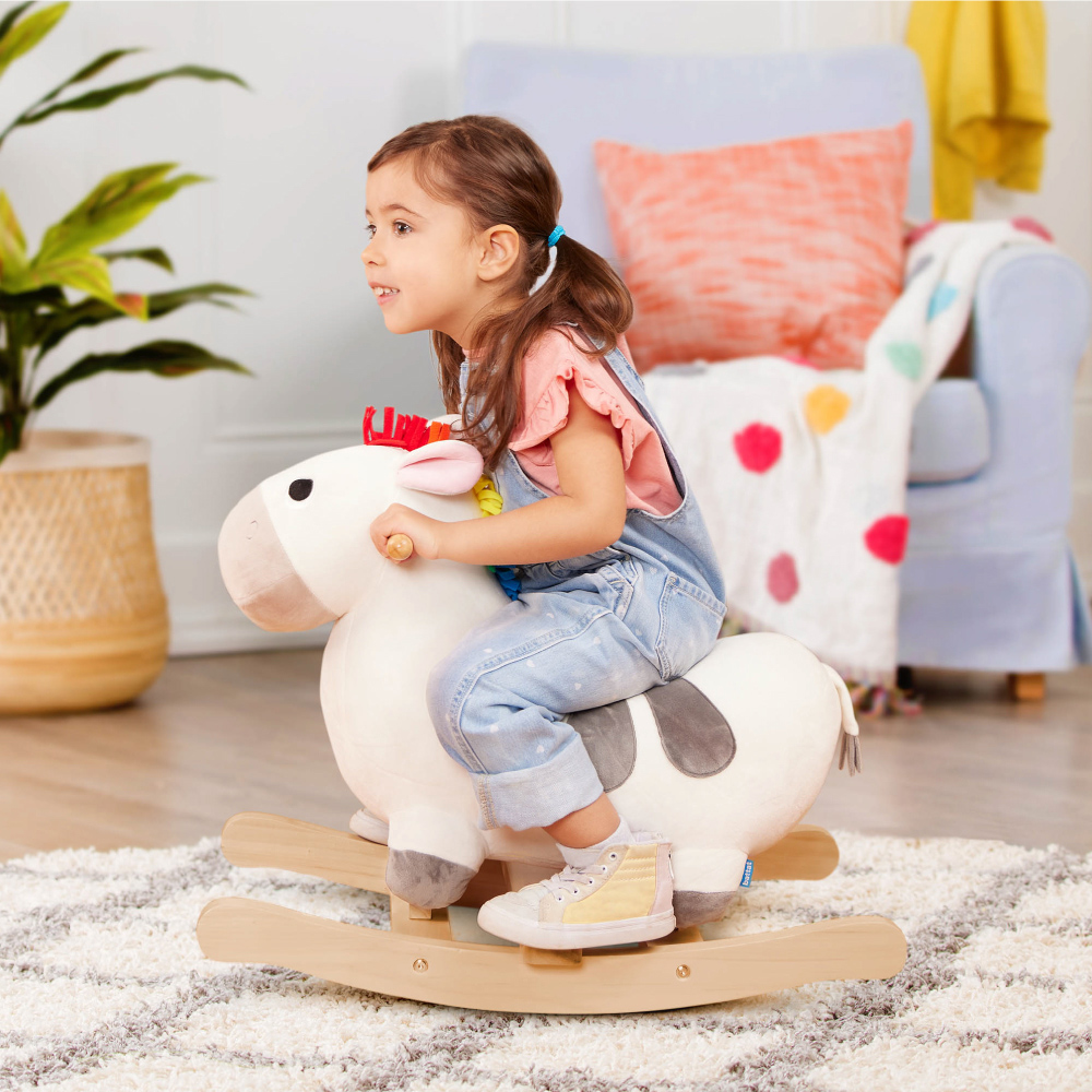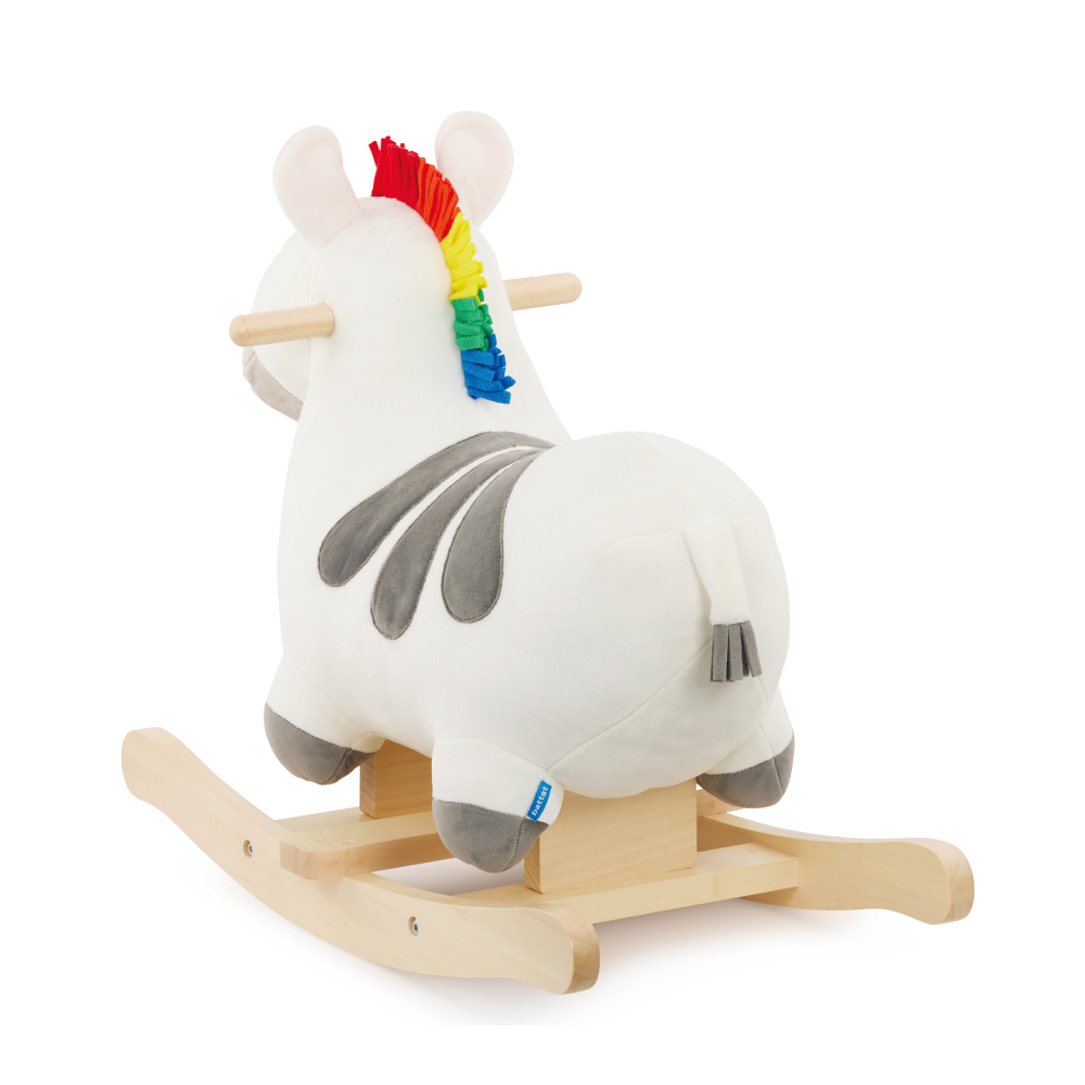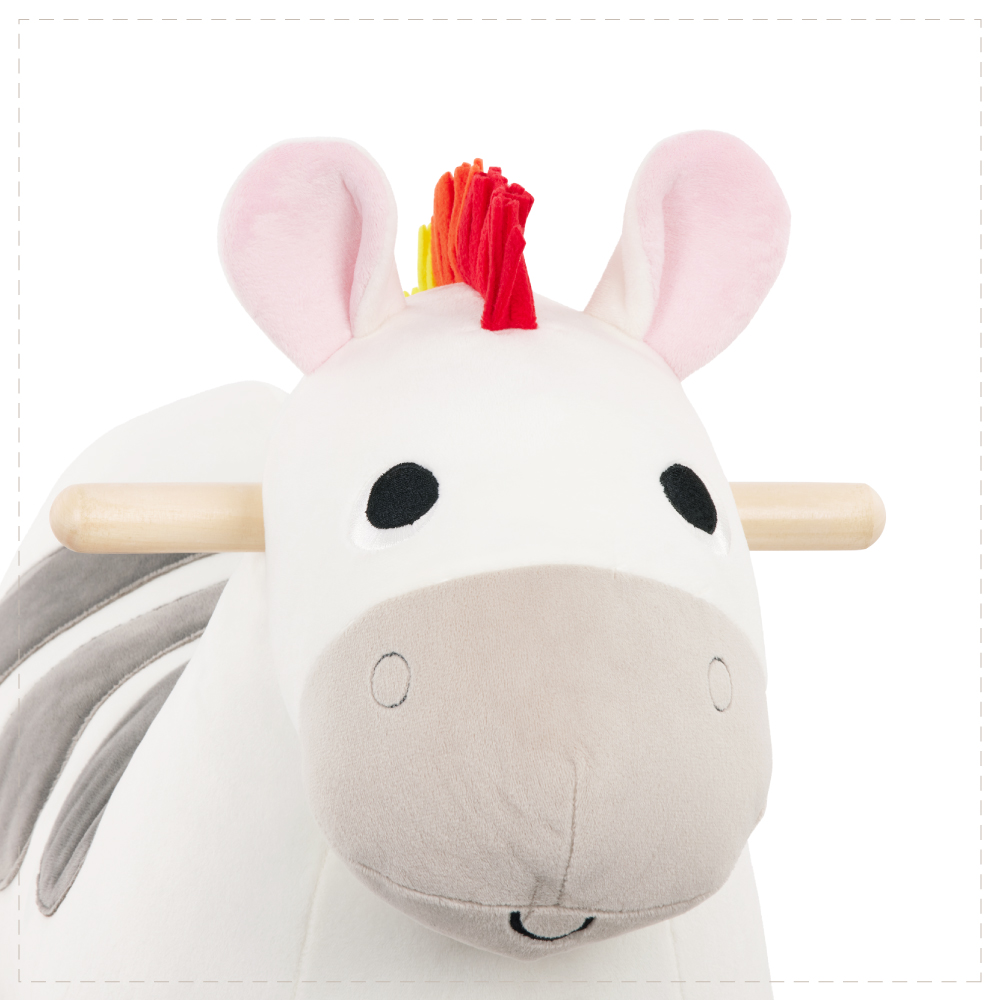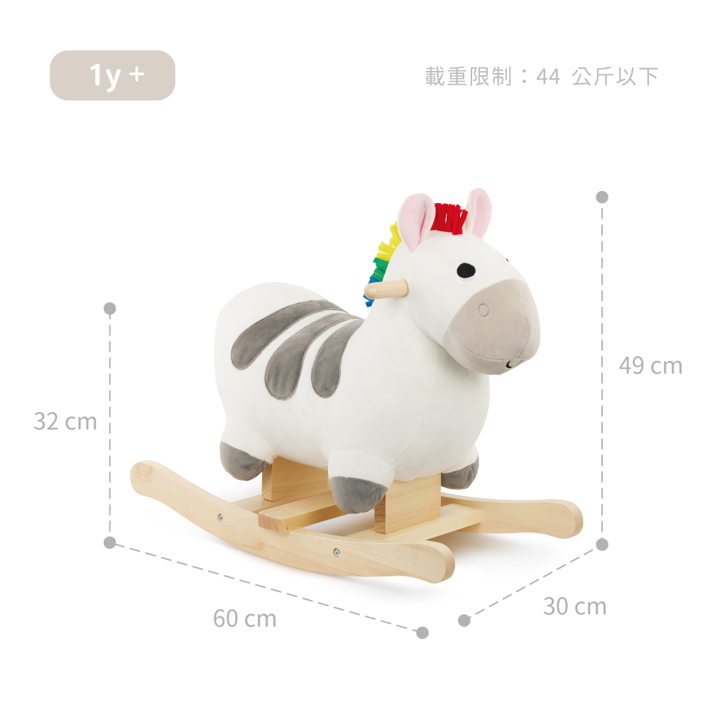 軟軟的圓潤身體好好坐,適合學步寶寶及每個幼兒,置腳架讓孩子踩得更安穩。天然原木材質,結合不同布料特性,練習觸摸、梳理馬鬃,刺激孩子觸覺及手指精細度練習,對比配色提供視覺刺激。體內藏有木頭機關,在孩子騎乘時模擬馬蹄聲,讓想像成真。