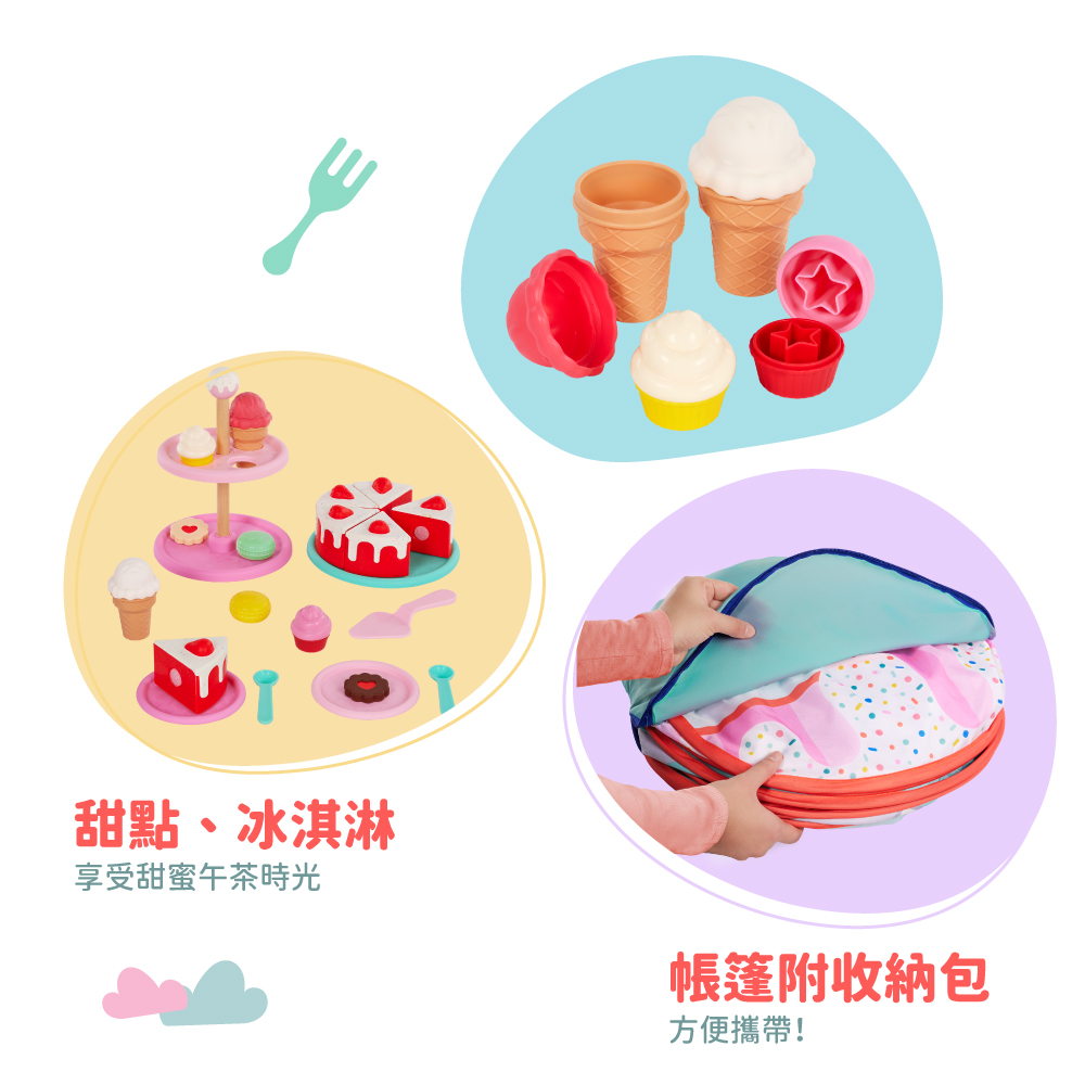 孩子們搖身一變成為甜點師,準備迎接第一位客人,打開帳篷,就像走進一間專屬的夢幻甜點小舖。