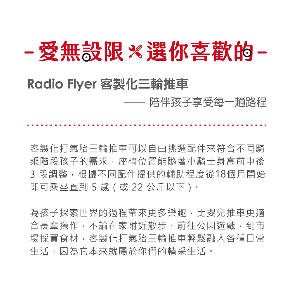客製化打氣胎三輪推車可以自由挑選配件來符合不同騎乘階段孩子的需求,座椅位置能隨著小騎士身高前中後 3 段調整,根據不同配件提供的輔助程度從 18 個月開始即可乘坐直到 5 歲 ( 或 22 公斤以下 )。
