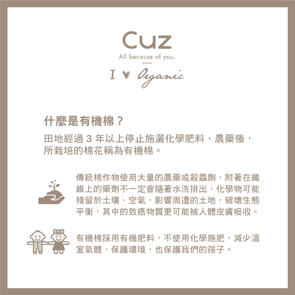 - 100% 天然有機棉,親膚透氣