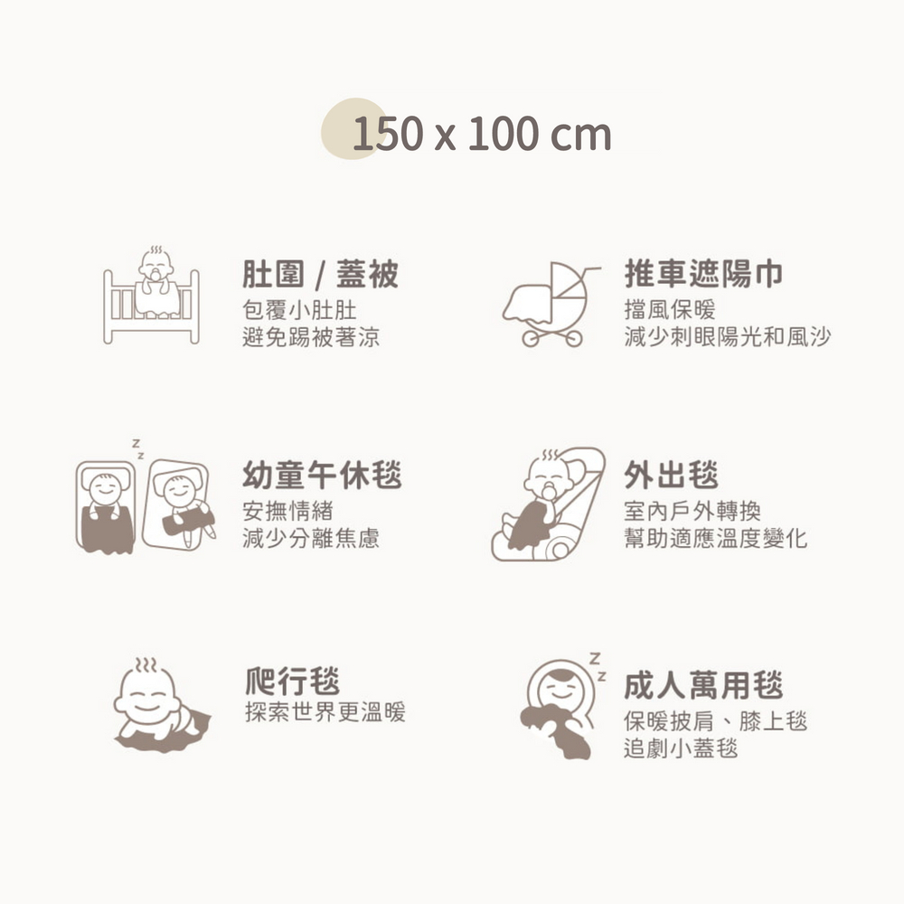 - 寶寶包巾、午睡毯、推車蓋毯、外出毯、遊戲毯、爬行毯