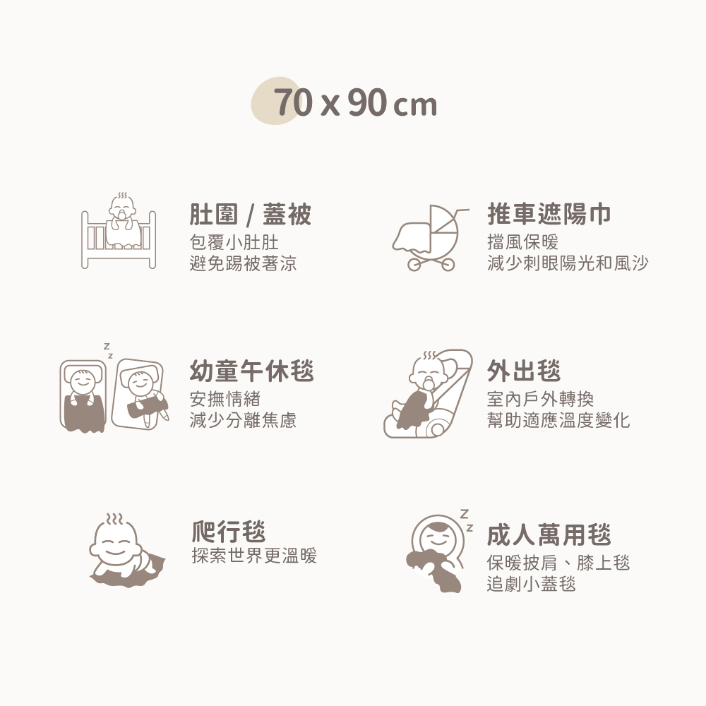 - 寶寶包巾、午睡毯、推車蓋毯、外出毯、遊戲毯、爬行毯