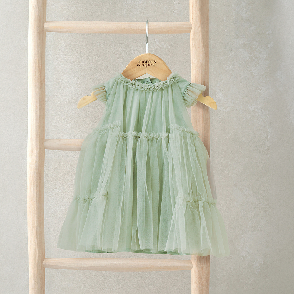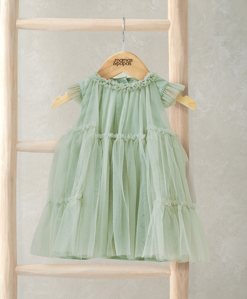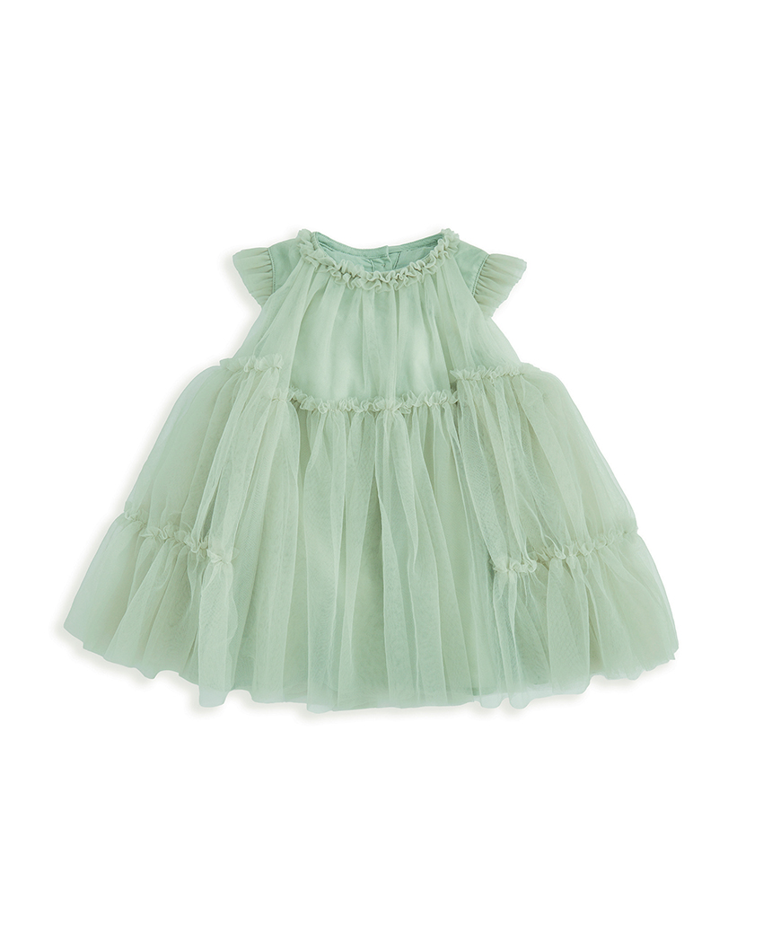 這款綠色網紗洋裝以抓皺拼接設計搭配小蓋袖剪裁,領口點綴柔軟荷葉網紗滾邊,細節精緻迷人,背面鈕釦開襟設計,穿脫輕鬆便利。