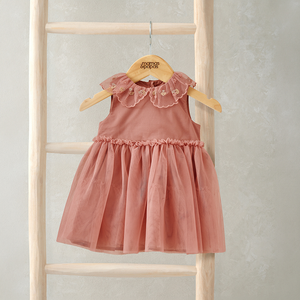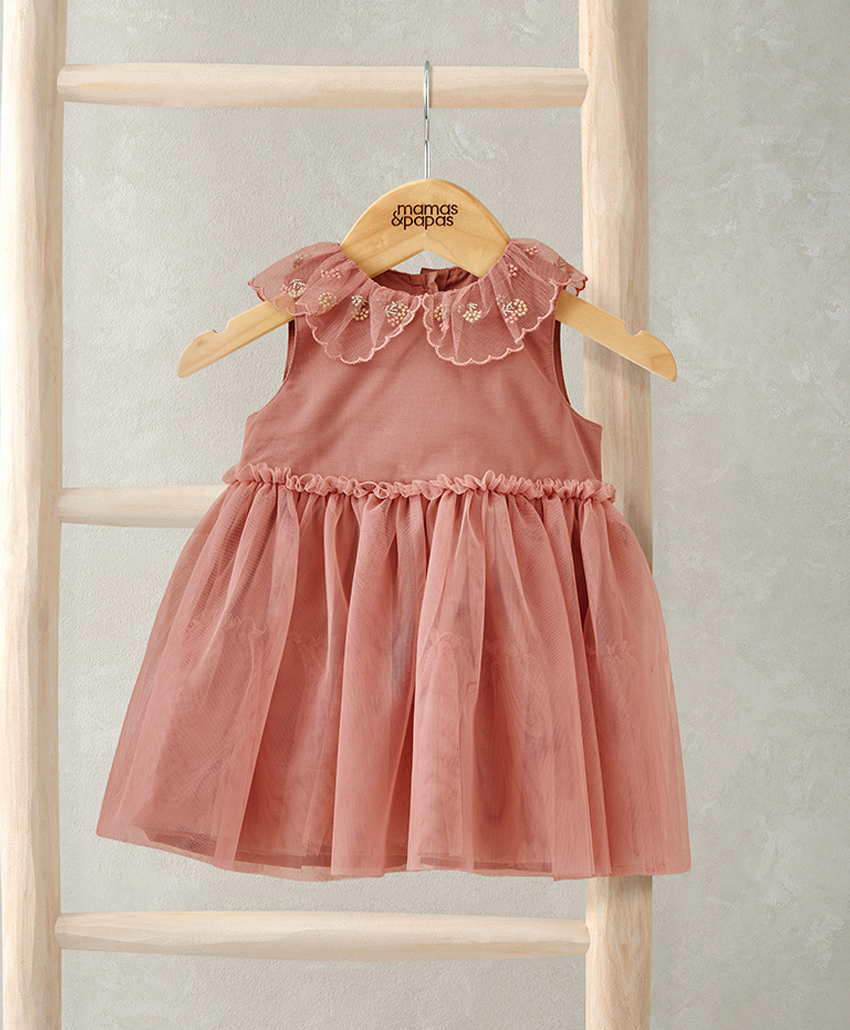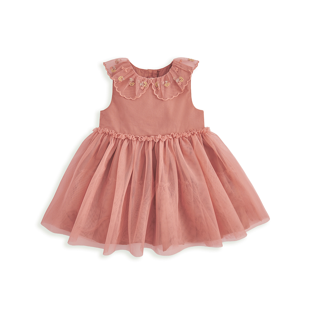 這款粉嫩色薄紗洋裝採無袖剪裁設計,搭配刺繡領口點綴,增添甜美細節,展現優雅氣質。