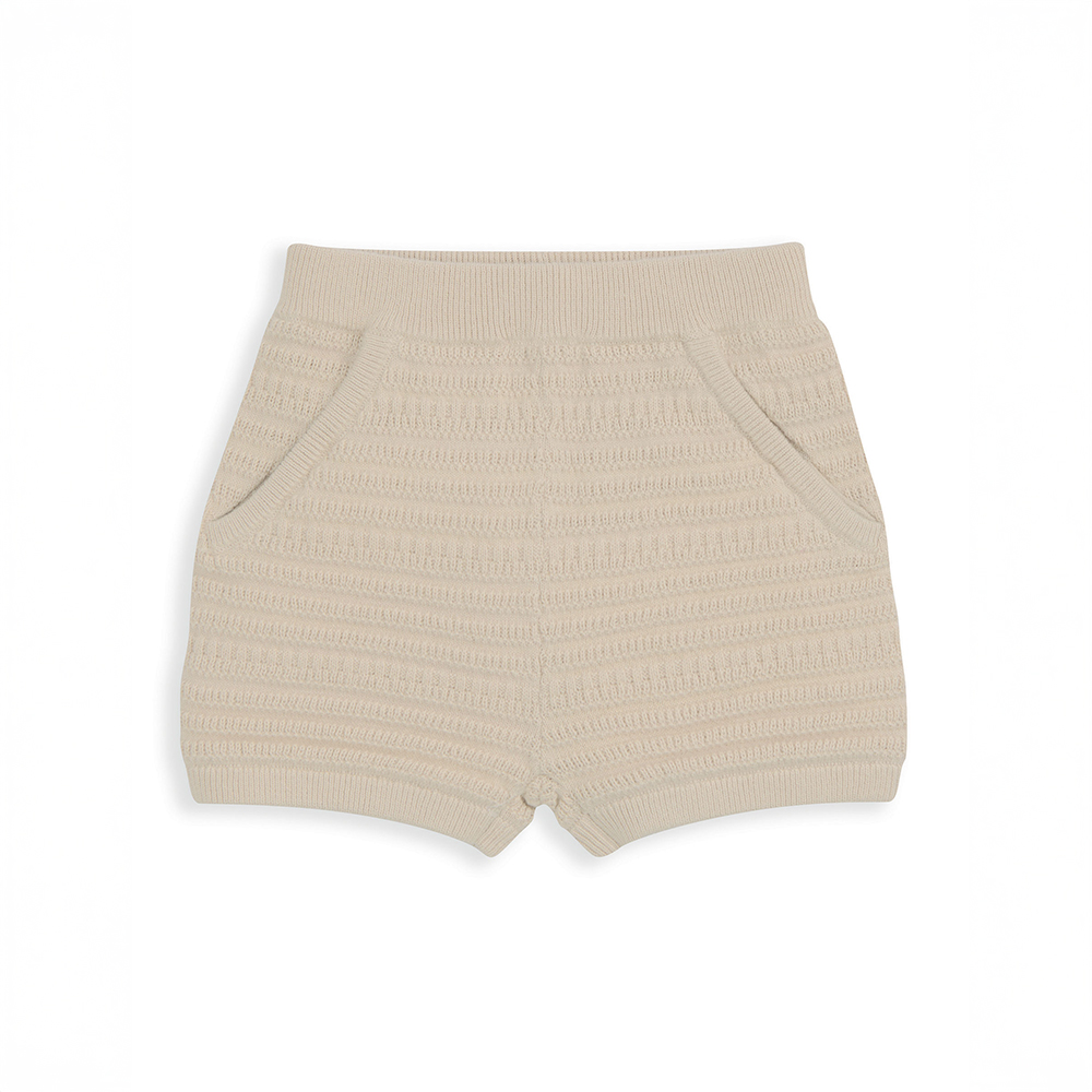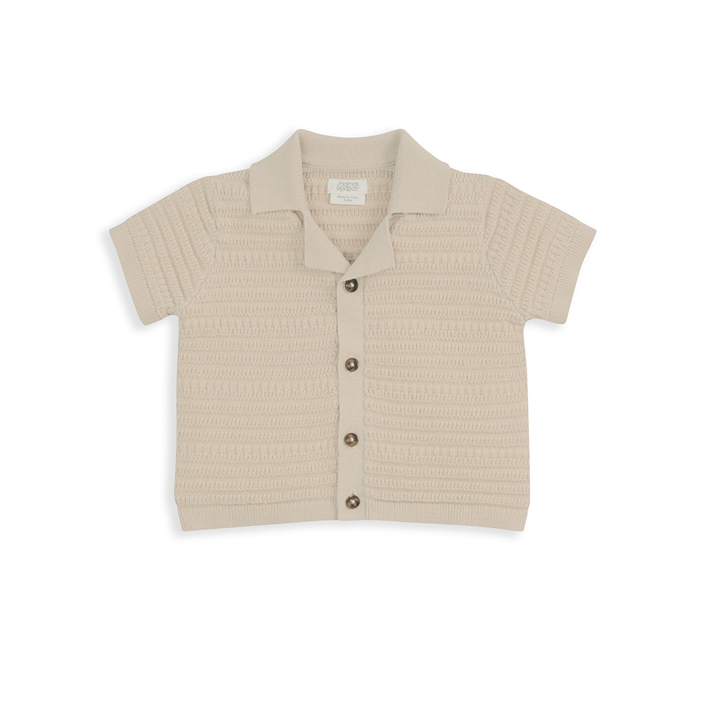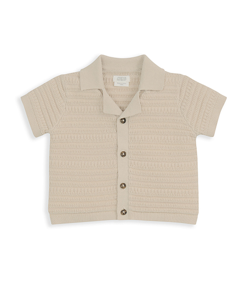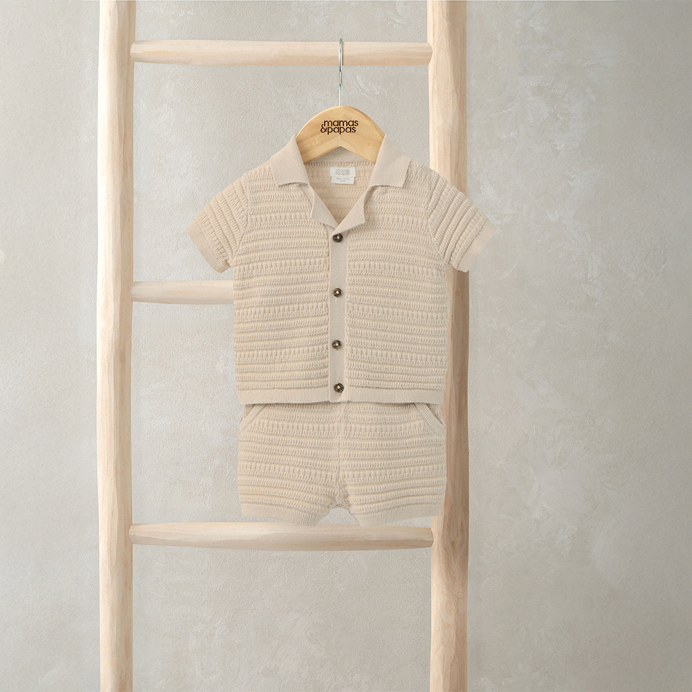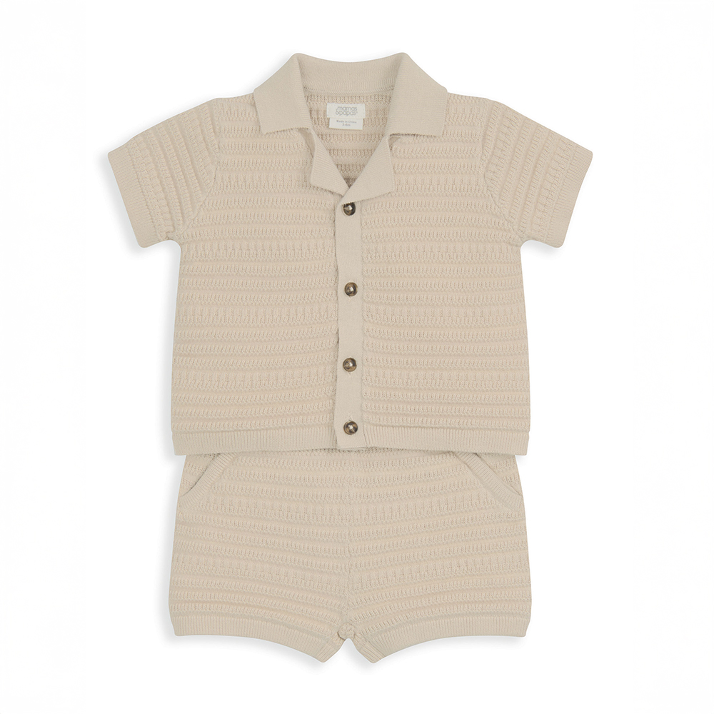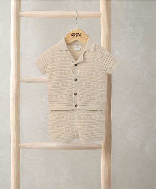 這款柔軟兩件式針織套裝。採用 100% 透氣棉質製成,短袖翻領 Polo 上衣搭配前方鈕釦開襟與羅紋袖口,簡單又有型;下身同色系短褲設計彈性羅紋腰頭、實用口袋與羅紋褲腳,舒適自在,讓寶貝輕鬆展現陽光俏皮感。