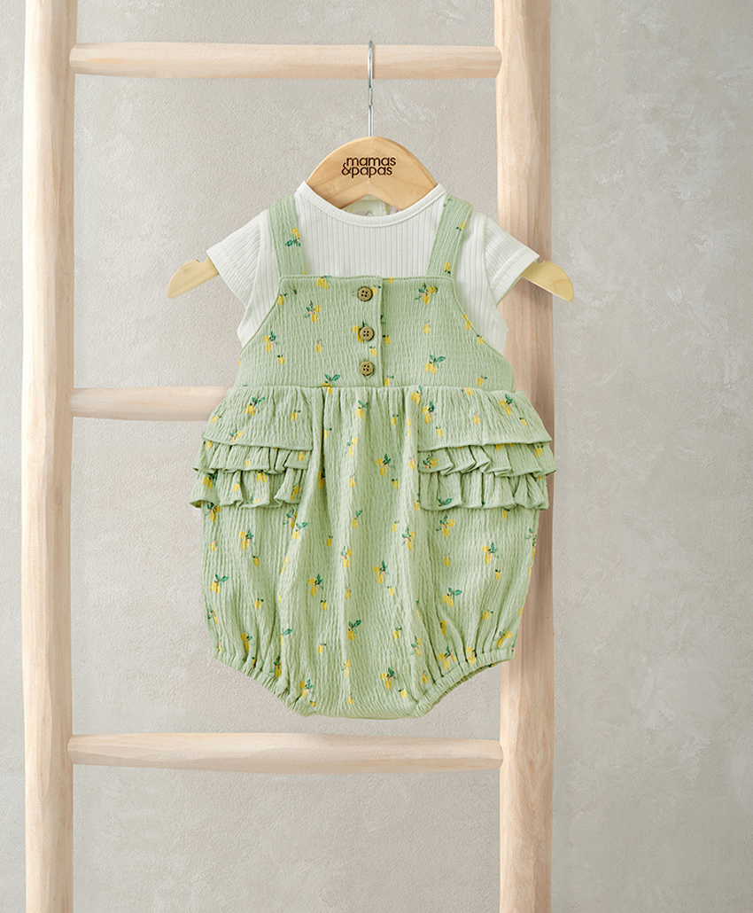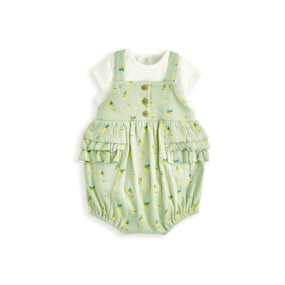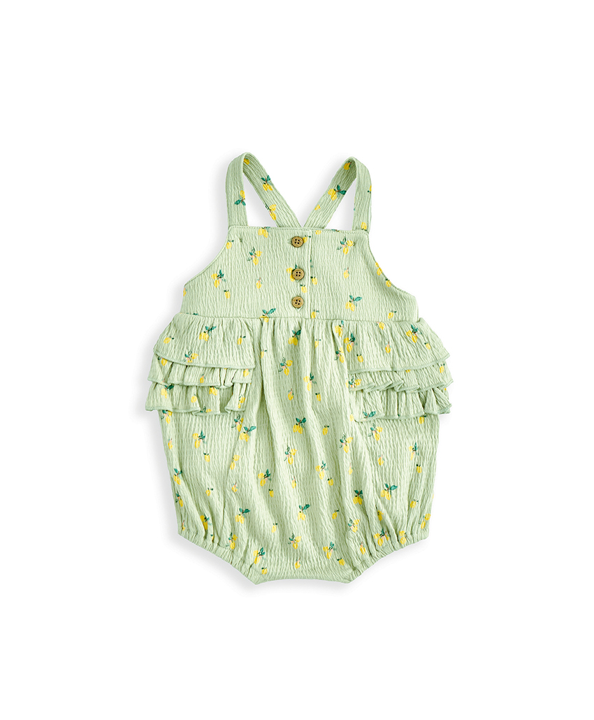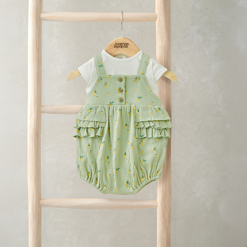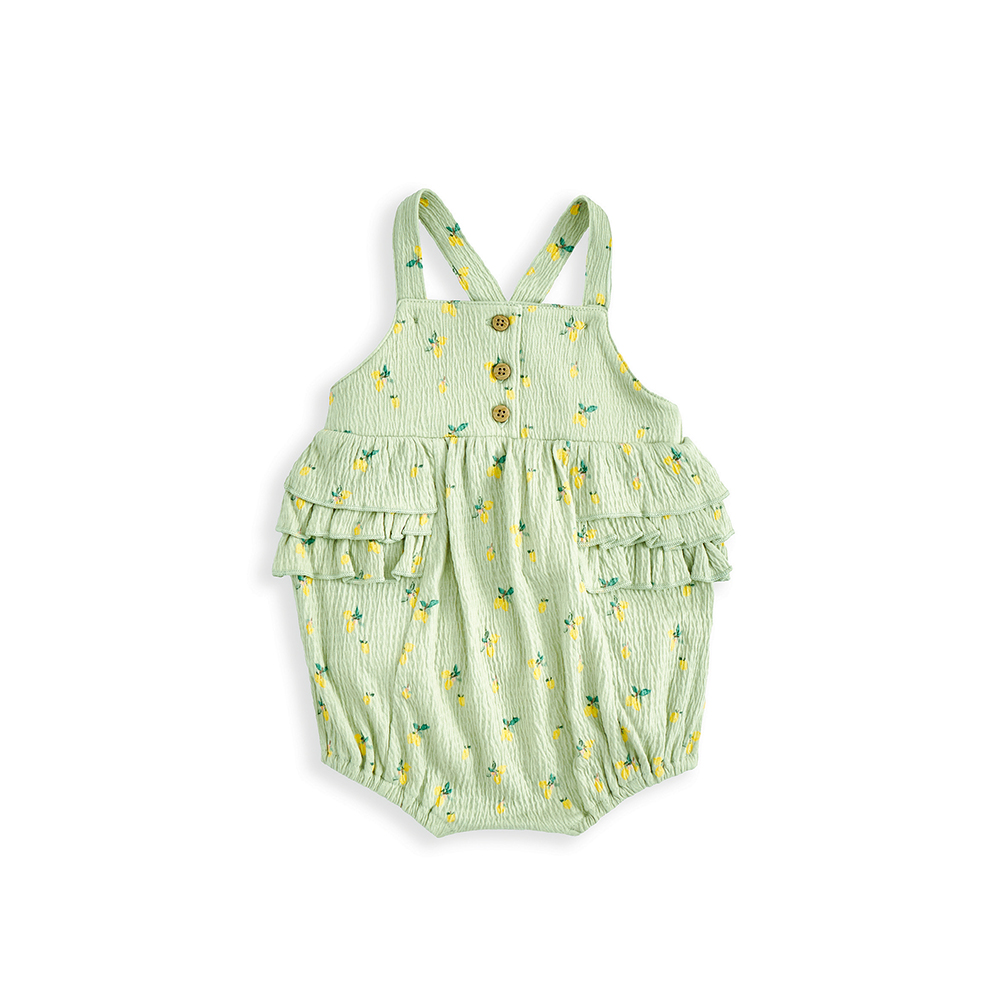 這款短袖吊帶包屁褲套裝以薄荷綠皺褶針織連身寬褲點綴檸檬印花,前後皆以抓皺荷葉細節設計,固定肩帶設計,褲腳採彈性收口設計,帶來舒適貼合的穿著體驗,胯部則設有隱藏式開釦,方便日常更換。