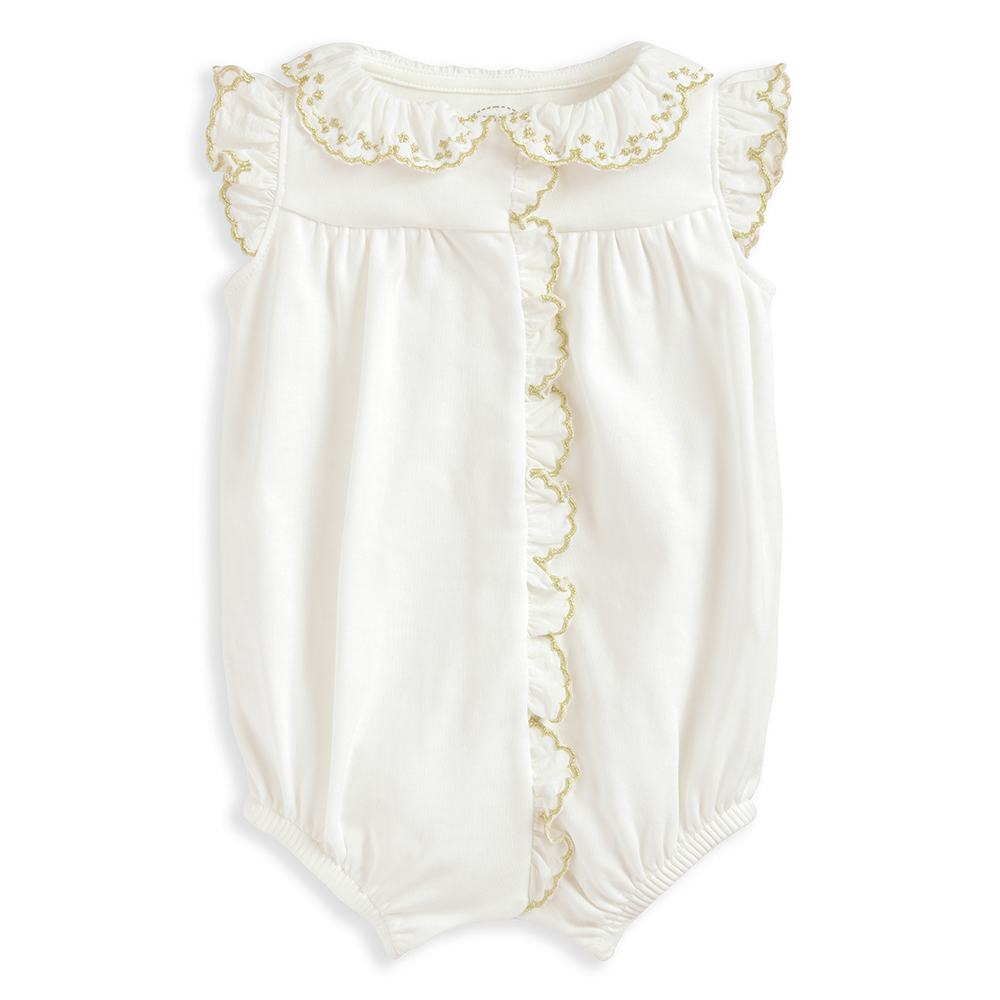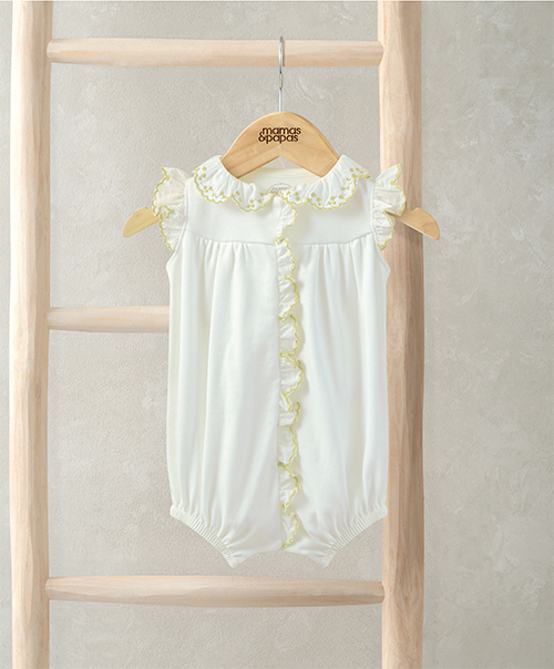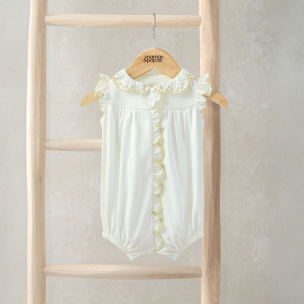 這款甜美的棉質無袖連身寬褲,是特別場合的可愛之選,兼具舒適與優雅感。設計採用波浪荷葉邊領口,點綴細緻刺繡細節,袖口與前開襟同樣搭配荷葉邊裝飾,整體造型精緻迷人。前襟與胯部開釦設計方便穿脫與更換,褲管鬆緊收口帶來柔軟貼合的舒適穿著體驗。甜美又實穿,是重要時刻的理想單品。