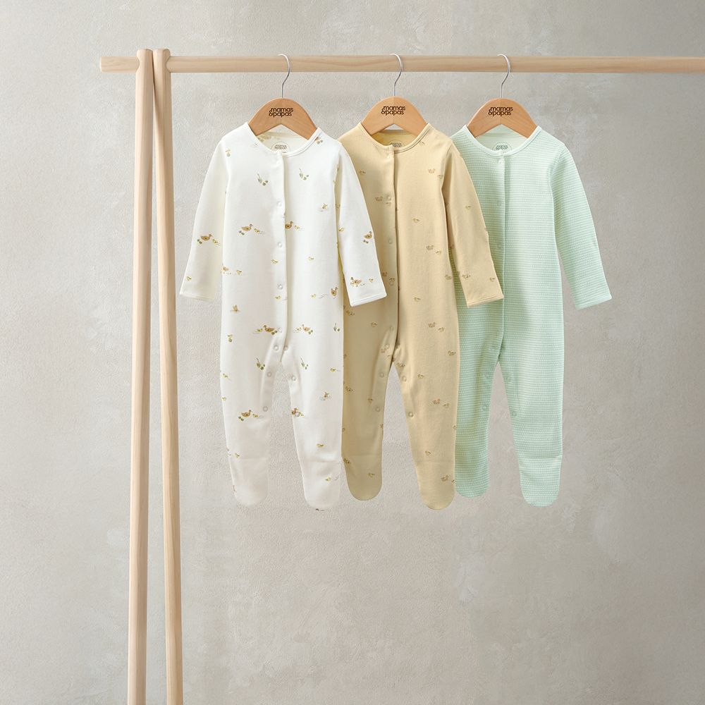 這組實用的連身衣 3 件組以 100% 純棉製成,柔軟透氣,適合日常穿著。每款皆設有包腳設計與前開式及胯部開釦,方便更換穿脫。組合包含:一款奶油色可愛小鴨印花、一款經典滿版條紋設計,以及一款奶油黃色小鴨圖案款式,甜美又百搭,陪伴寶貝安心入睡。
