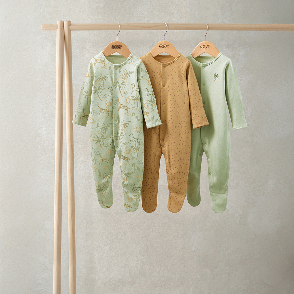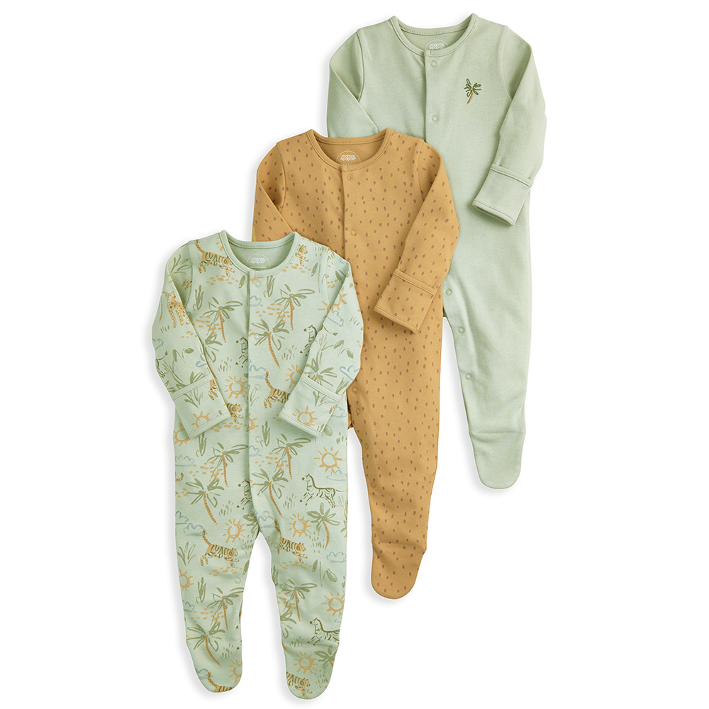 這組實用的連身衣 3 件組以 100% 純棉製成,柔軟透氣,適合日常穿著。每款皆設有包腳設計與前開式及胯部開釦,方便更換穿脫。組合包含:一款橄欖綠底趣味陽光叢林印花、一款橘色滿版圓點設計,以及一款橄欖綠款式搭配胸前棕櫚樹刺繡圖案。充滿童趣與活力的配色與設計,讓寶貝在每個夜晚都能舒適入眠。