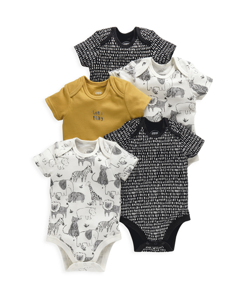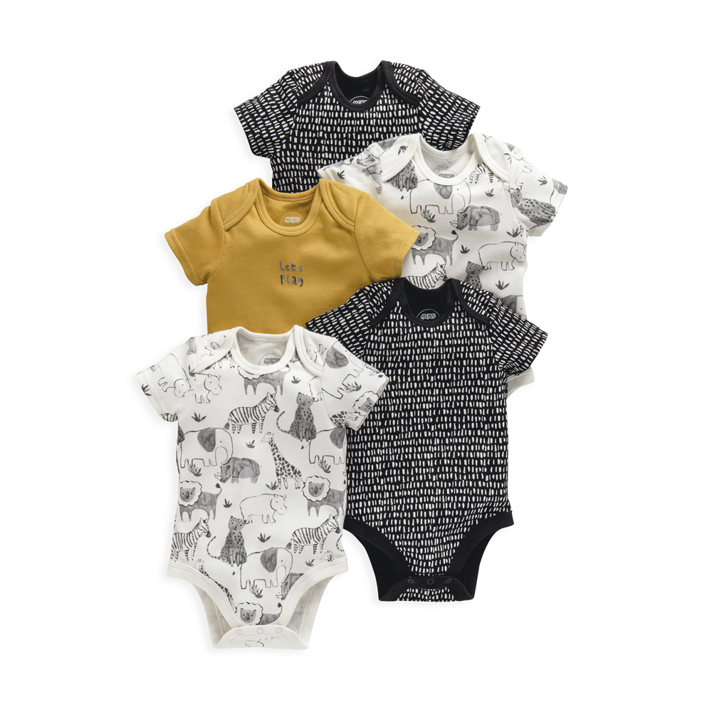 包屁衣的材質彈性佳且質料舒服,圖案設計很可愛,配色活潑亮眼,一組五件很方便,不會容易有選擇障礙,寶寶穿的開心,媽媽也開心!