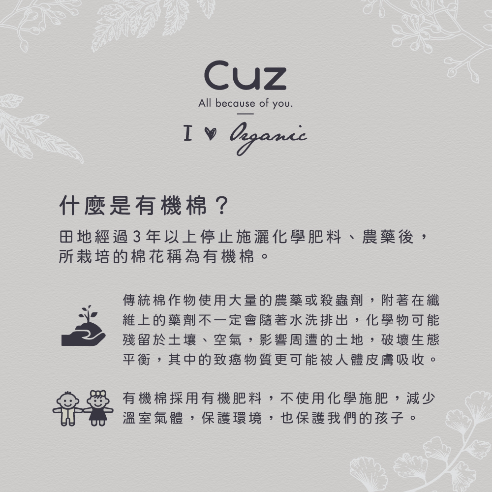 本產品符合 GOTS 全球有機紡織品標準認證有機纖維的領導認證,無柔軟劑添加。禁止使用甲醛、芳香劑等化學物質,從原料、紡紗、織造、染色……到最終產品,須符合環保有機、友善環境的標準
