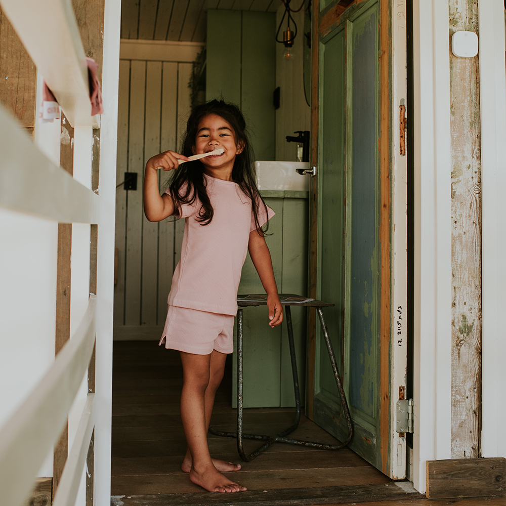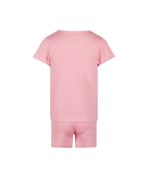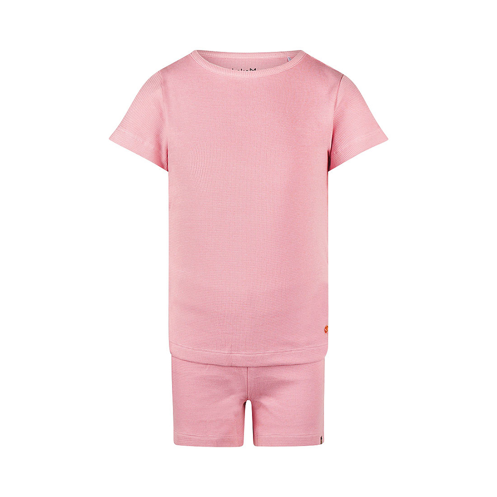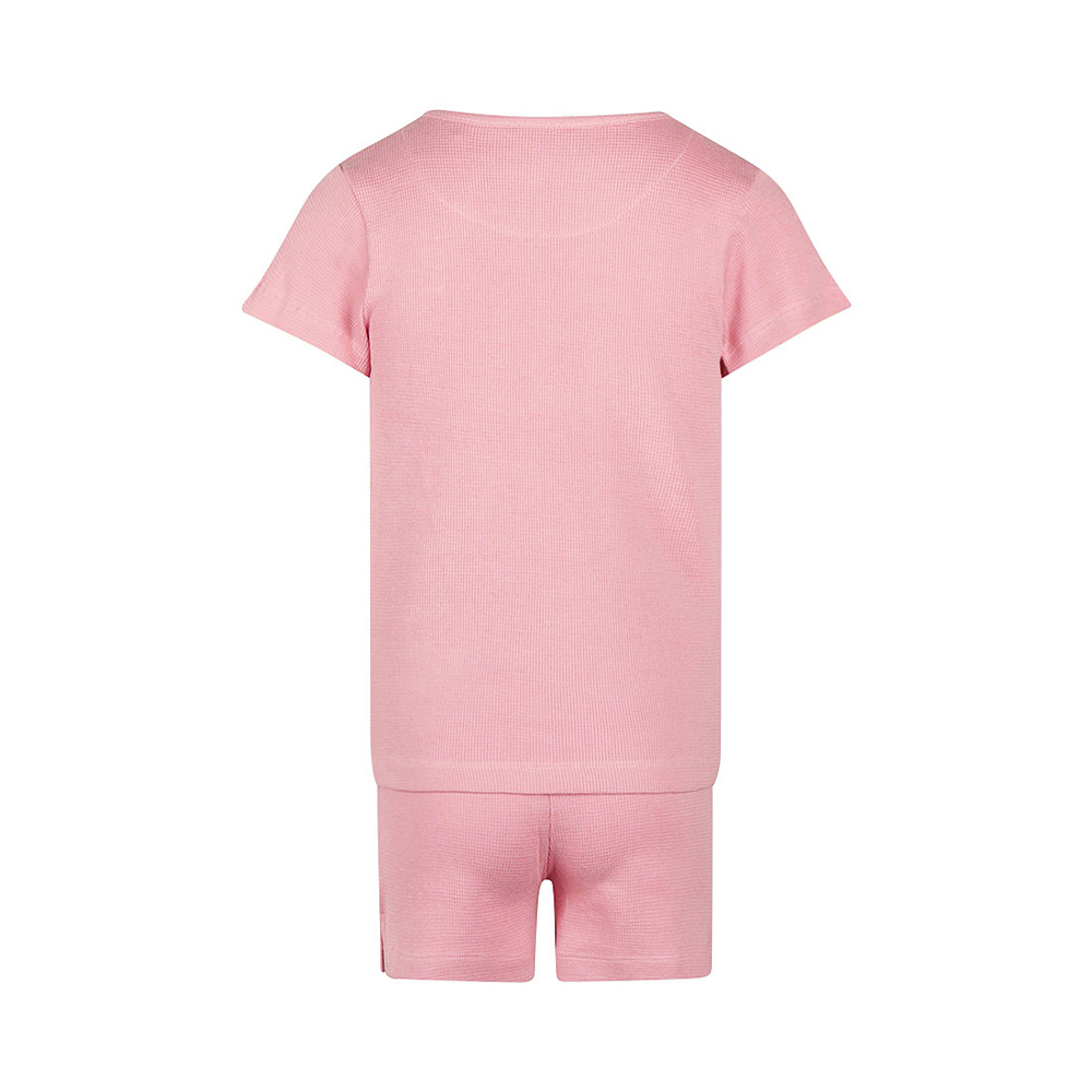 這款 Koko Noko 粉色短袖套裝,包含短袖上衣與同色短褲,採用柔軟華夫格紋棉製成,觸感親膚、透氣舒適,給孩子最自在的穿著體驗。